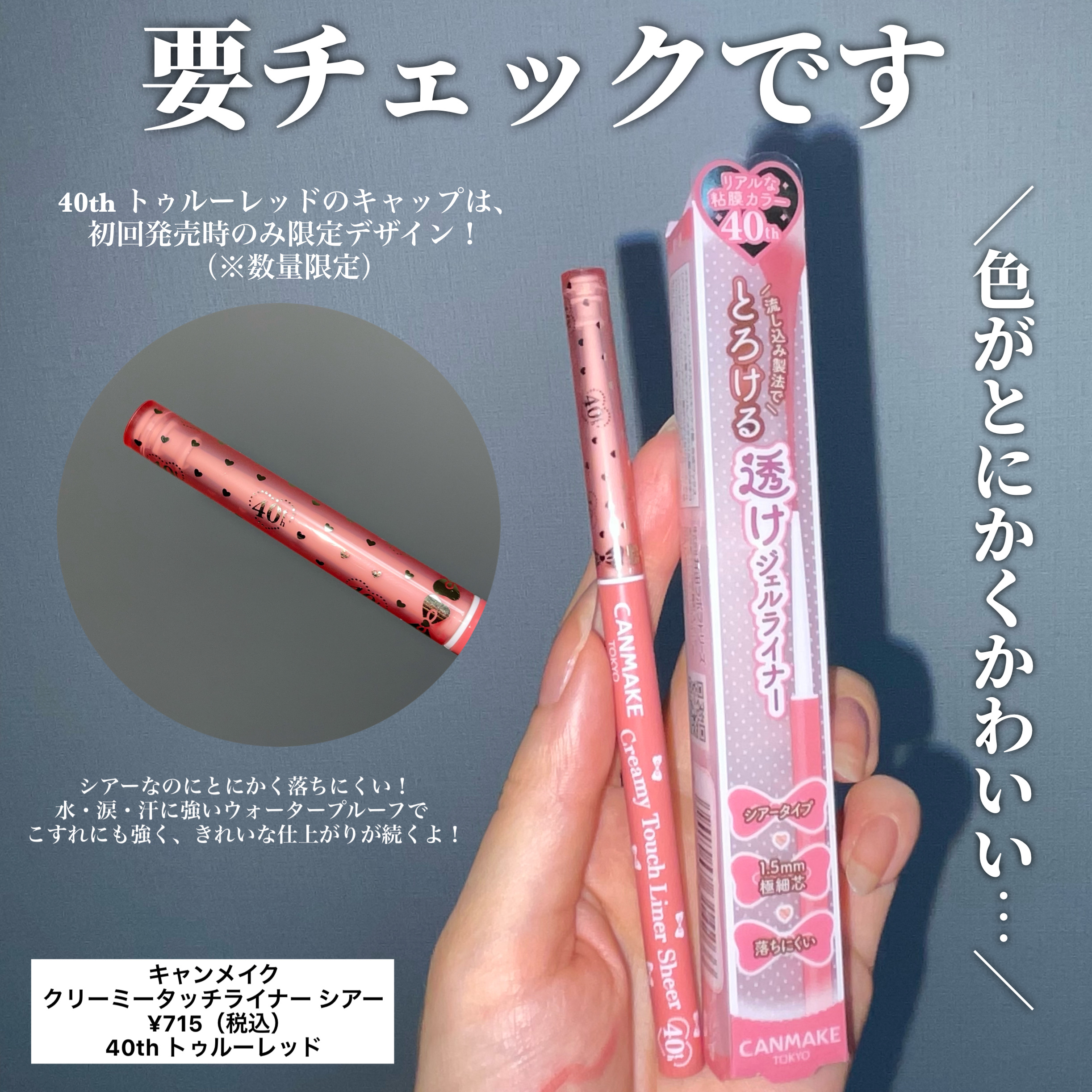 - 1.5㎜のとろける描き心地の極細ジェルライナー「クリーミータッチライナー」から、シアータイプが登場! 肌に溶け込むような透け発色で、メイク感を抑えた自然な仕上がり。 シアーなのにとにかく落ちにくい! 水・涙・汗に強いウォータープルーフで こすれにも強く、きれいな仕上がりが長時間続きます。 肌あたりが優しいやわらかな芯で、ラインを引く際にまぶたへの引っ掛かりも少なく肌をすべるようにスルスルとアイラインが引けます✨ 40th トゥルーレッドのキャップは、40周年記念として初回発売時のみ限定デザインで登場💗(※数量限定) ※初回限定キャップがなくなり次第通常キャップに切替となります。 【注意】 ★大変柔らかい芯ですので、芯は1㎜程度繰り出してお使いください。 ★一度繰り出した芯は戻りませんのでご注意ください。 ★芯が乾かないように、必ずキャップを閉めて保管してください。