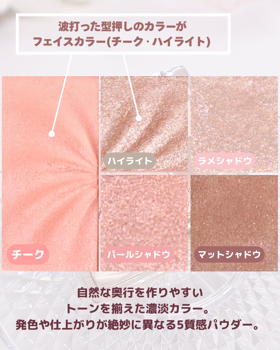 - 頬&目元のメイクが1つで完成するパレット。 チーク・ハイライト・アイシャドウが1つのパレットにin! 使いやすい”カラー×質感”で誰でも簡単にメイク完成♪ 自然な奥行を作りやすいトーンを揃えた濃淡カラー。頬と目元の色味を合わせて統一感アップ! 発色や仕上がりが絶妙に異なる5質感パウダー。しっとりした粉質でくすみにくく、メリハリ立体感を演出! チップ・ブラシ付。 (ふんわり色づく毛量たっぷりミニブラシ・しっかり色づく肌当たり柔らかなチップ) 01 ピュアコーラル:柔らかいコーラルベージュのウォームトーン。温かみのある優しい印象に。 02 クラッシーピンク:上品なくすみピンクのクールトーン。大人っぽくて可愛い印象に。