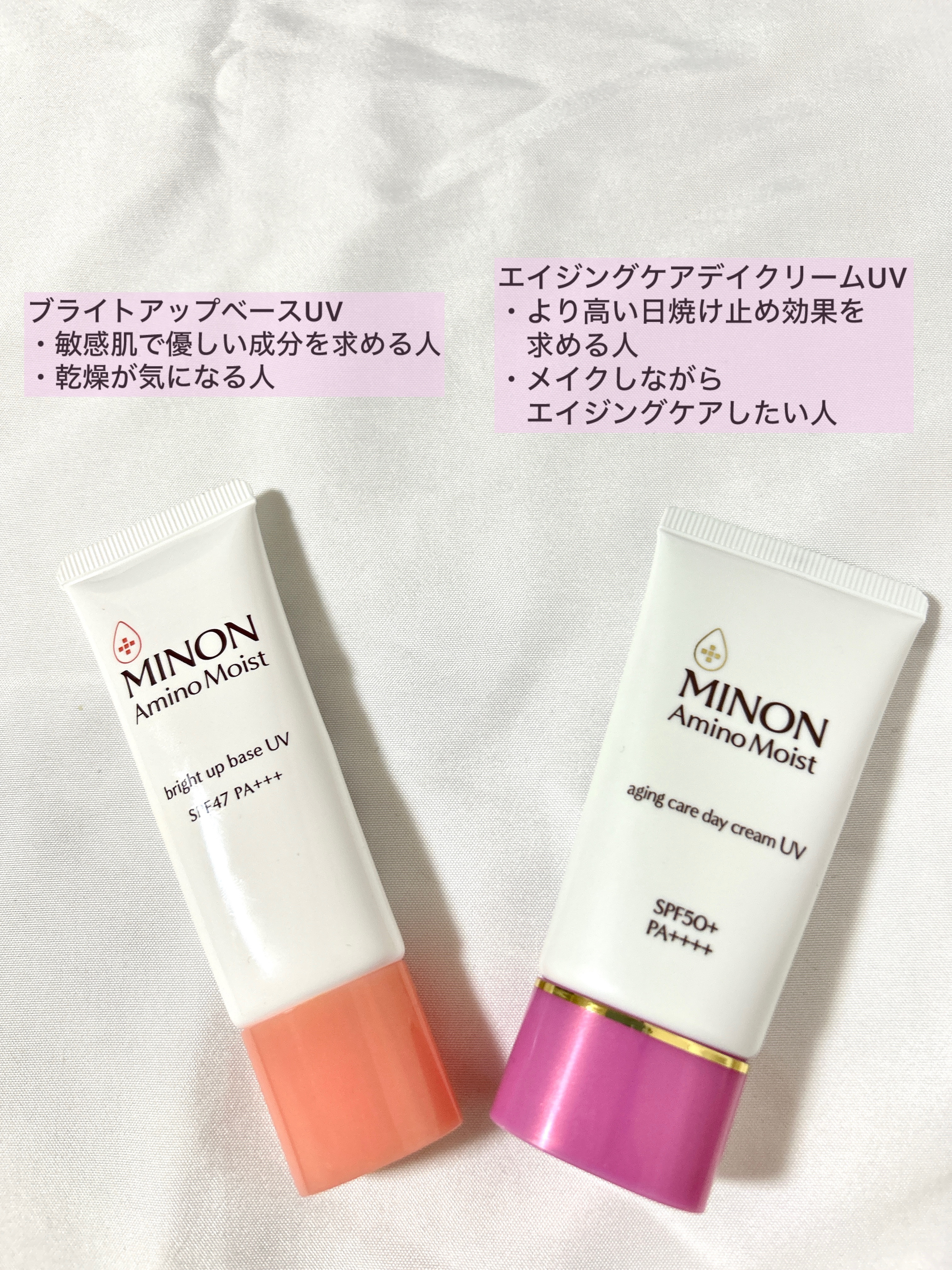 だいすきなミノンの新作UV下地を既存のものと比べてみました☺️💗 ブライトアップベースUVは春夏向け。エイジングケアデイクリームUVは秋冬向け。かなと思いました✨ クレドポーのヴォワールコレクチュールnと似てる仕様感なのはブライトアップベースUVの方です👀!