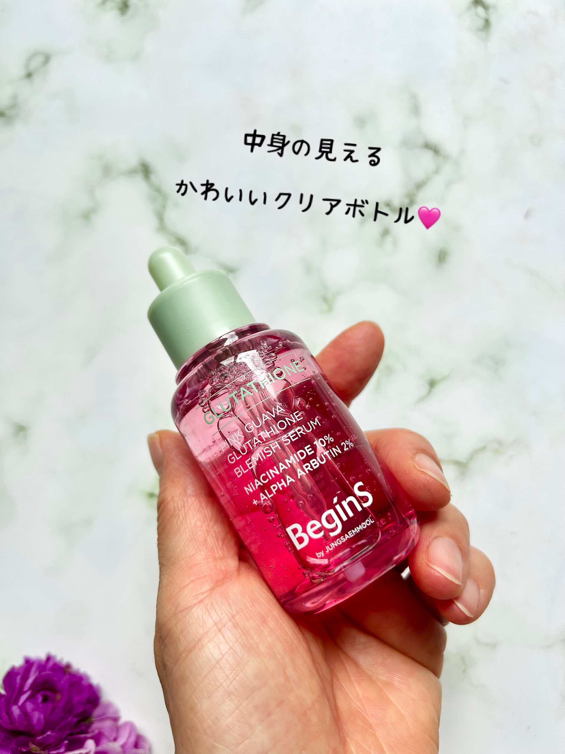 - 1)100時間低温抽出の済州産ピンクグアバ*1使用 みかんの4倍*2、りんごの3倍*2以上のビタミン*3を含む 済州産のピンクグアバを収穫+選別! 2)グルタチオンブレミッシュショット*4™ 純度99%*5のリポソームグルタチオン*6とナイアシンアミド*6などを組み合わせ、 肌をすこやかに保ち、つややかで明るい印象へと導くBegins独自のケア成分コンプレックス *1 グアバ果実エキス(整肌成分) *2 原料的な特性に限る *3 グアバ1個あたりのビタミンC含有量基準 *4ナイアシンアミド、α-アルブチン、グルタチオン、グアバ果実エキス、ヒポファラムノイデス水(すべて保湿成分) *5 純度の数値は配合成分に関する参考地であり、製品の効果を保証するものではありません。 *6整肌成分
