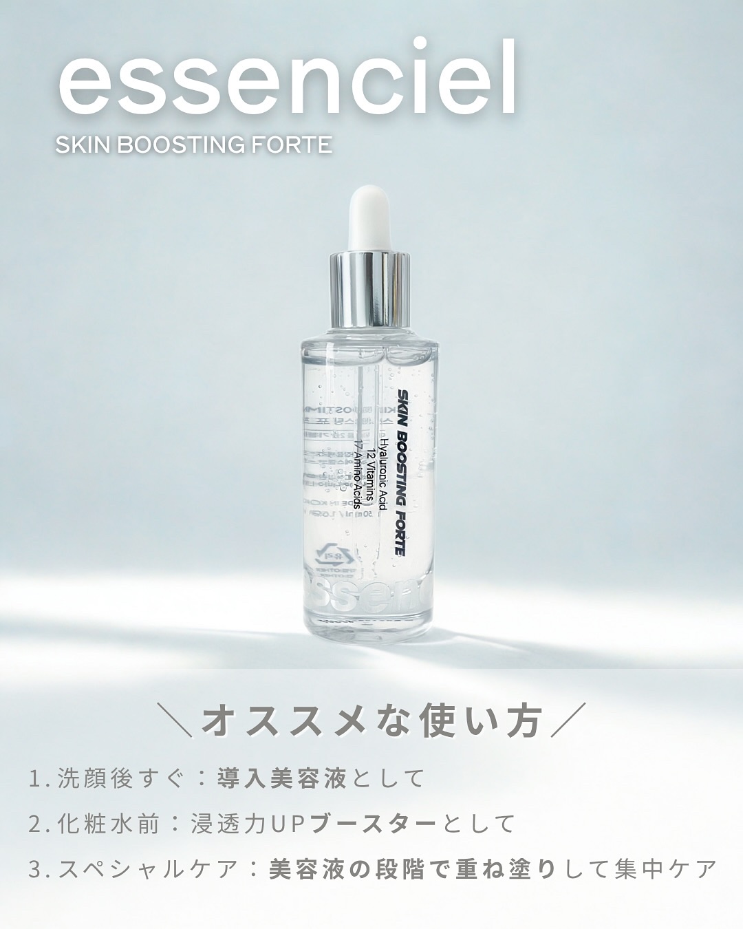 essenciel(エッセンシエル)スキンブースティングフォルテアンプル自然なハリとツヤ、透明感のある肌へ。乾燥小ジワが気になる方や、メイク下の乾燥が気になる方に。ヒアルロン酸・ビタミン・アミノ酸コエンザイム・グルタチオン・ベルギーの温泉水配...