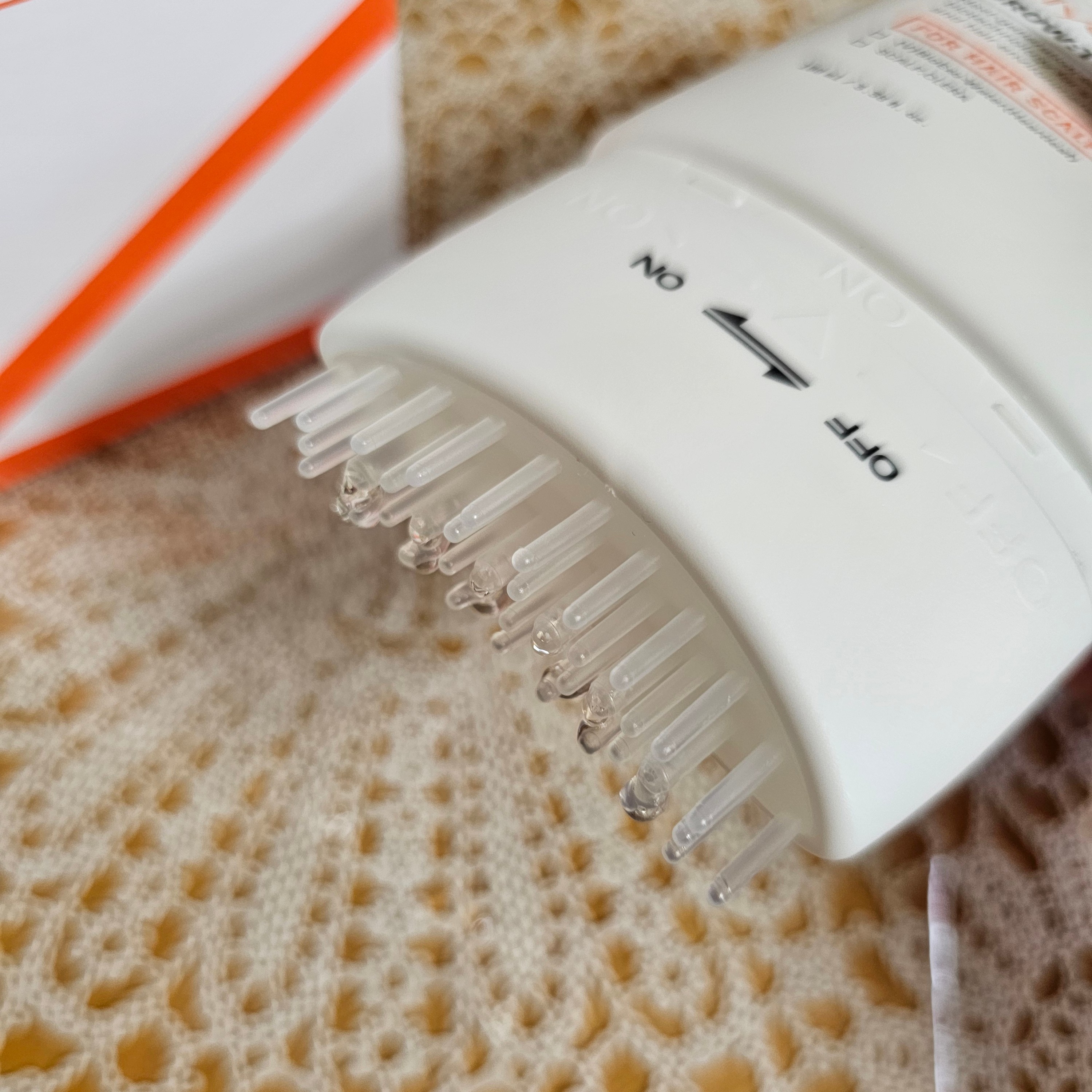 ふたを外すと、上のブラシ部分が回転します。OFFをONにすると出てくる仕様です。これ、便利!ブラシはかたすぎず、頭皮にきもちいいやわらかさ。写真はテクスチャわかりやすいように手に出しましたが、直接頭皮につけられて便利です。少しとろみのあるテク...