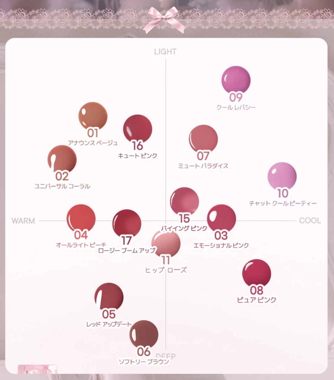 - 唇にぴたっ!長時間クリアな血色感が続く*しっとり感を閉じ込めて、乾燥のしにくい丁度いいツヤ感のナチュラルツヤリップに水分とオイルの黄金比率で、穏やかに揺れる波のような水分テクスチャー *当社調べ、個人差があります。 <01 アナウンス ベージュ(ANNOUNCE BEIGE)> イエベ春~秋にぴったりな、杏子ベージュ ベース(イエベ春&秋) <02 ユニバーサル コーラル(UNIVERSAL CORAL)> トーンを選ばない、クリアなコーラルカラー(イエベ春) <03 エモーショナル ピンク(EMOTIONAL PINK)>SOUL SOULがクールになるブルベ夏ピンク(ブルベ夏&ミュート) <04 オール ライト ピーチ(ALL RIGHT PEACH)> イエベ春ライトの顔色がパッと明るくなる、ブライト ピーチ(イエベ春ライト) <05 レッド アップデート(RED UPDATE)> イエベ秋にぴったりな、クリアなレッド(イエベ秋) <06 ソフトリー ブラウン(SOFTLY BROWN)> クリアに発色する、ブリックビーンカラー(イエベ秋ミュート) <07 ミュート パラダイス(MUTE PARADISE)> クールな温度を身に着けたクールベースカラー(ブルベ夏ミュート)