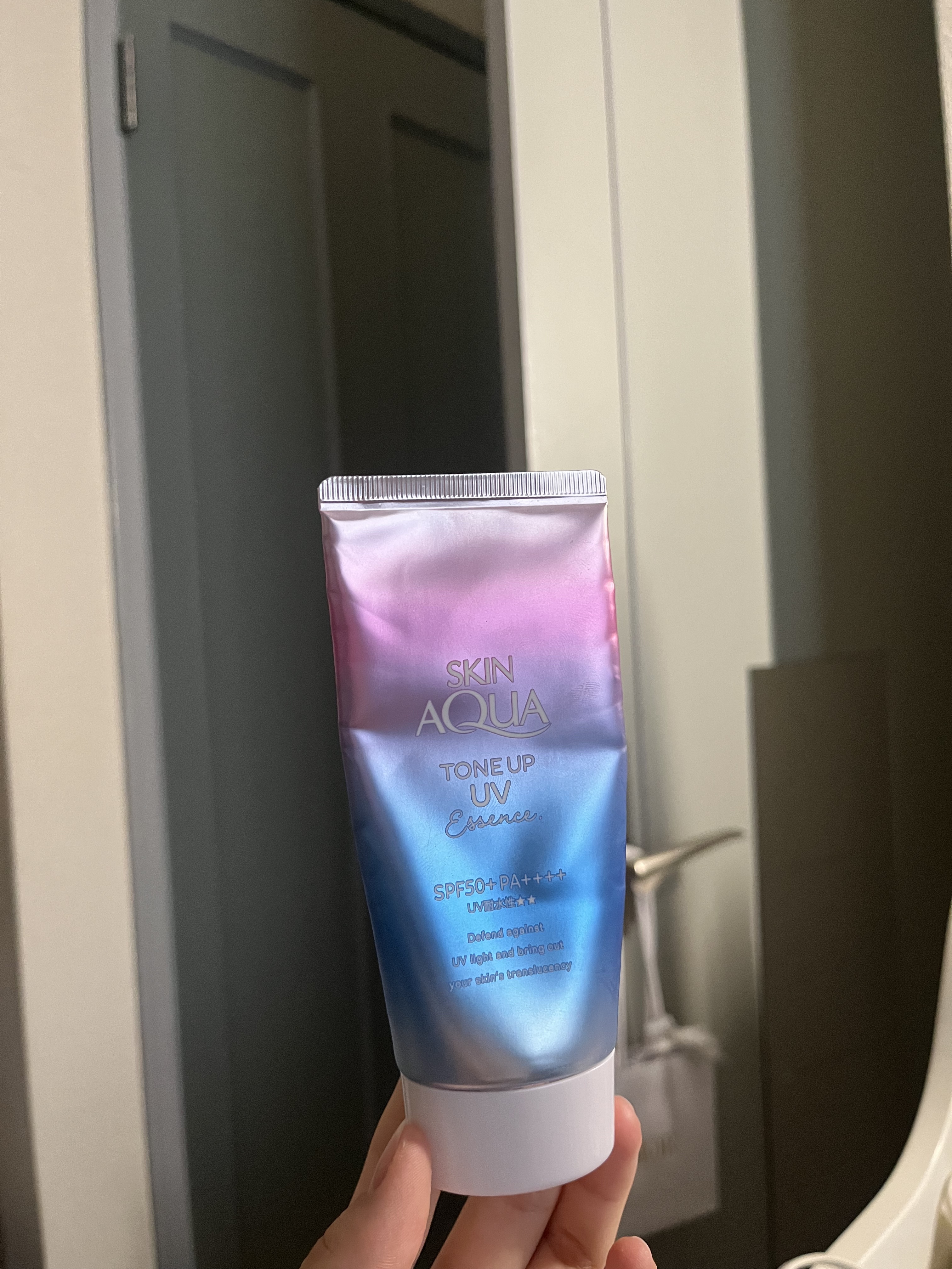 - ※カラー名称「ハピネスオーラ」は「ローズ」へ名称変更となりました。 <ミントグリーン> 赤み補正*1!UVカットしながら、色と光をコントロールし、肌をトーンアップ*1。 ミントグリーンカラーで透き通るような素肌つづく!エッセンスタイプの日焼け止め。 透明感*1のある肌に。 SPF50+、PA++++、UV耐水性★★。 鉱物油フリー。パラベンフリー。ときめくサボンの香り。 <ラベンダー> 明るさ補正*1!UVカットしながら、色と光をコントロールし、肌をトーンアップ*1。 透明感*1を引き出すラベンダーカラーの日焼け止め。 すーっとのびて、みずみずしい使い心地のエッセンスタイプ。 SPF50+、PA++++、UV耐水性★★。 鉱物油フリー。パラベンフリー。ときめくサボンの香り。 <ローズ> 血色感補正*1!UVカットしながら、色と光をコントロールし、肌をトーンアップ*1。 ローズカラーで血色をプラスし、透明感*1のある肌に。 エッセンスタイプの日焼け止め。 SPF50+、PA++++、UV耐水性★★。 パラベンフリー。ハピネスブロッサムの香り。 <ブルー> UVカットしながら、色と光をコントロールし、肌をトーンアップ*1。 血色感を抑えて儚げな色白肌*1に見せるブルーカラーの顔・からだ用日やけ止め。すーっとのびて、みずみずしい使い心地。 透明感ブルー×透明感ホワイト=はかなげブルーカラーで、自分史上最高*2の色白肌*1、うるおう美容液成分(うるおい成分)としてヒアルロン酸Na、ビタミンC誘導体*3配合。 SPF50+/PA++++。こころがときめくサボンの香り。化粧下地にも。石けんで落とせます。 パラベンフリー。鉱物油フリー。アレルギーテスト済み(全ての方にアレルギーが起こらないというわけではありません)。 *1:メイクアップ効果による *2:スキンアクアシリーズにおいて *3:リン酸アスコルビルMg(うるおい成分)