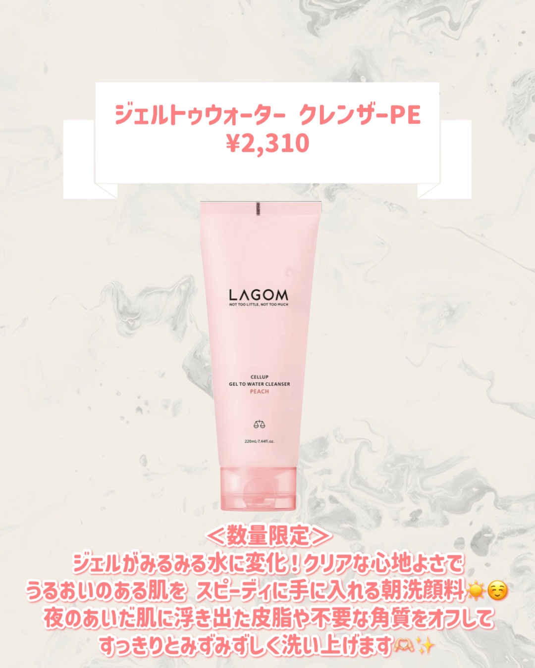 - 〈数量限定〉 ジェルがみるみる水に変化! クリアな心 地よさでうるおいのある肌を スピーディに手に入れる朝洗顔料 ぷるんとしたジェルからウォータータイプのテクスチャーに変化する、泡立て不要の朝用洗顔料。夜のあいだ肌に浮き出た皮脂や不要な角質をオフして、すっきりとみずみずしく洗い上げます。桃ペプチド*1と桃果実エキスのコンビネーションで、うるおい、ハリ、透明感*2のある肌へ。さらに肌の水分保持力に着目した成分、「アクアリシア(AQUALICIA®)*3」が肌にうるおいをとどめます。多幸感あふれるフレッシュピーチの香り。 POINT 1. 時短が叶う!シンプルステップ 乾いた肌に伸ばして洗い流すだけ。水洗顔のようにクイックな、泡立て不要の時短洗顔料。朝、クリーンな肌にしないままスキンケアやメイクアップをしてしまうと、肌トラブルのもとになってしまいます。〈ラゴム〉のジェルトゥウォーター クレンザーは、水洗顔だけでは落とせない皮脂汚れもきちんとオフしながら、洗い上がりはしっとり。ドライ、オイリー、センシティブ、幅広い肌タイプの方にお使いいただけます。 POINT 2.ピーチ由来のスキンケア成分を配合 桃種子ペプチド*1と桃果実エキスのコンビネーションで、うるおい、ハリ、透明感*2のある肌へと導きます。 POINT 3.敏感な肌もみずみずしく洗う 水系のべース+天然由来の界面活性剤の採用で、敏感な肌もやさしく洗顔できます。さらに、肌の水分保持力に着目した成分「アクアリシア(AQUALICIA®)*」が健康な肌へと導き、肌を乾燥させるクレンジングの悪循環をストップします。 キー成分 ◯アクアリシア(AQUALICIA®)*: 肌のうるおい保持力をサポートします。 ◯桃種子ペプチド*1 &桃果実エキス:うるおい、ハリ、透明感*2のある肌へと導きます。 *1 モモ種子エキス/保湿成分 *2 うるおいを与えて透明感をもたらす *3 加水分解野菜タンパク、マルトデキストリン/共に保湿成分 ドンキ・アピタ・ピアゴにて数量限定発売