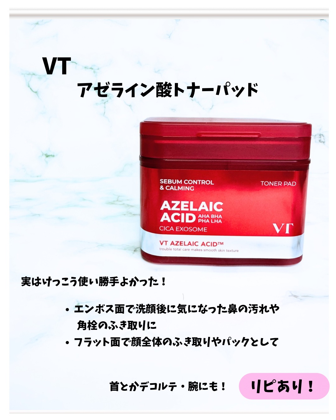VTのアゼライン酸2種使い切りました✨AZケアマスクとAZケアトナーパッド、使い切ってみて、それぞれ合った使い方があるように感じたのでまとめてみました🥰★AZケアマスク30枚入り(定価2,640円)ニキビ予防のマスク🩷★AZケアトナーパッド6...