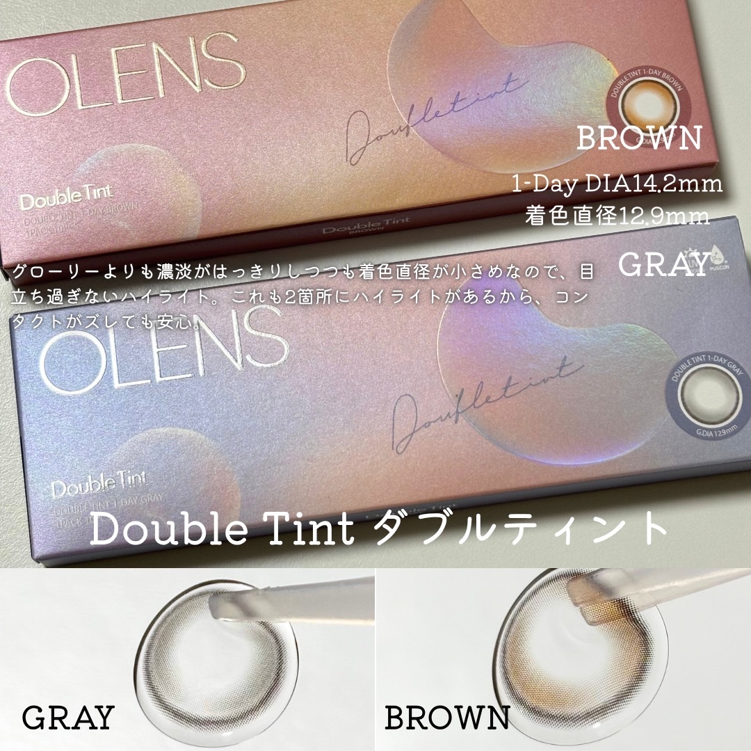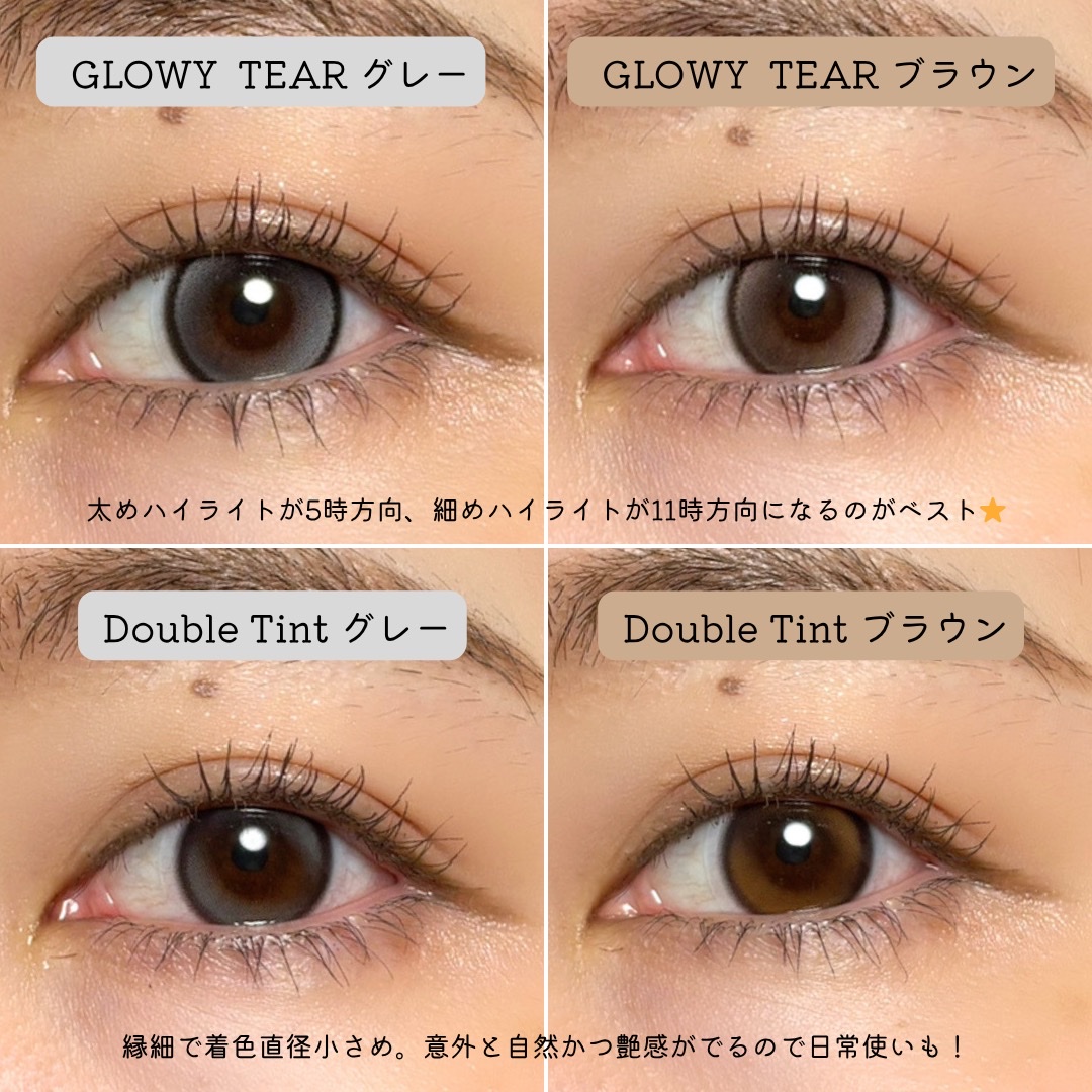 水光カラコンなのに回っても変にならないカラコン!!OLENSのGlowytearBrown&GrayとDoubleTint1dayBrown&Gray✨この2シリーズはダブルハイライトなので、回っても気にならない👏🏻Glowytearの2色は...
