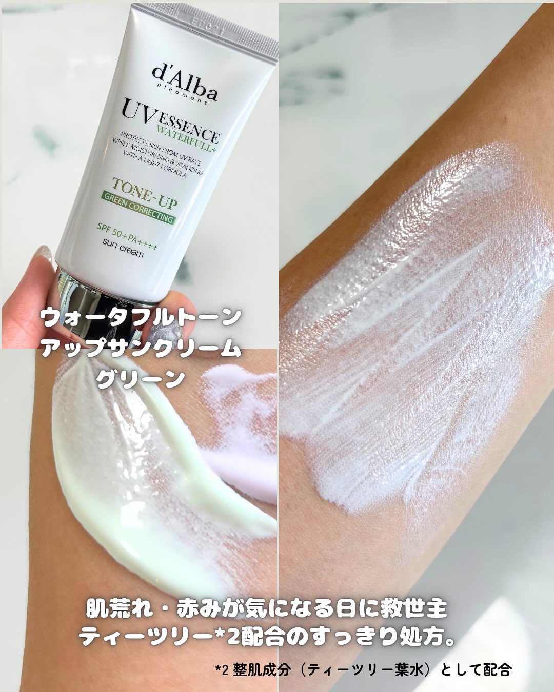 @dalba_japanウォータフルトーンアップサンクリーム一本でベースメイク完成するd'Albaの色で選べる日焼け止め3種・ピンク血色感を出したい時、ナチュラルに仕上げたい日初心者向けのアイテム・パープル補色効果で黄ぐすみを抑えトーンアッ...