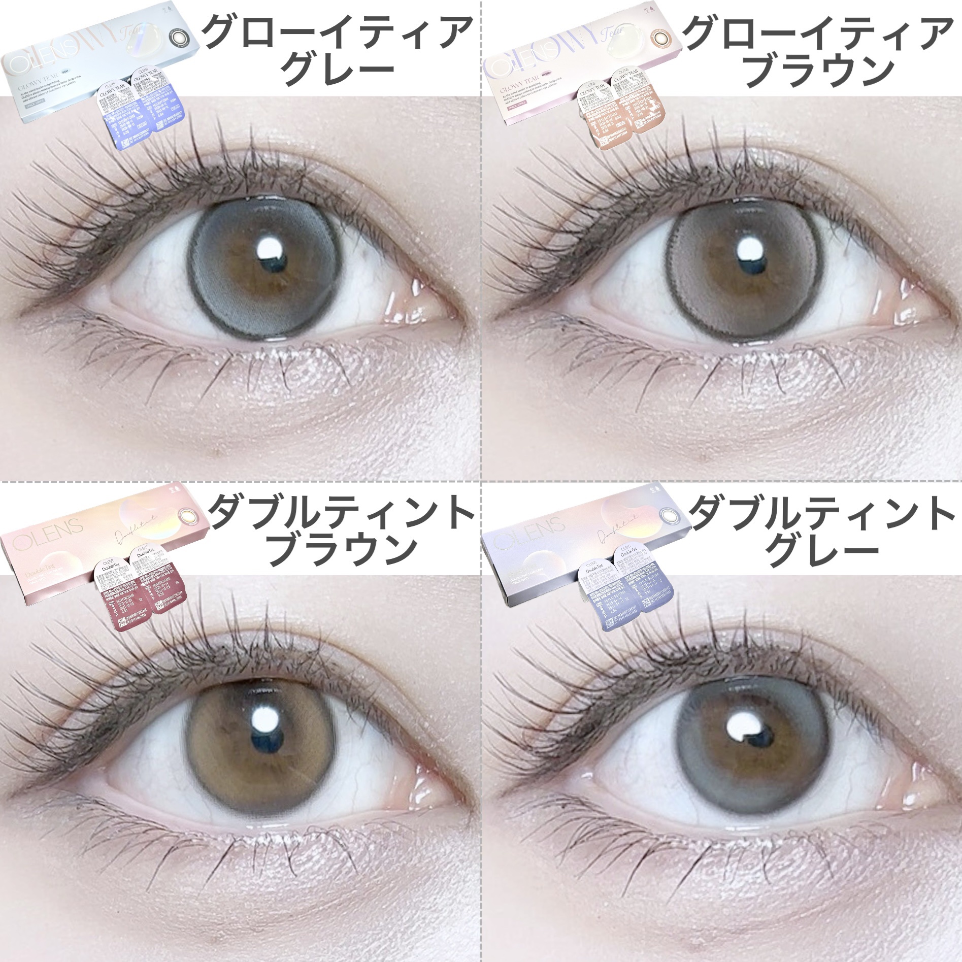 \激盛れカラコン4種比較(新作含む!)/オーレンズのDoubleTintブラウン/グレーと、新作のGLOWYTearGlowyTearブラウン/グレーを比較してみたよ!スペックはこんな感じ!▶︎DoubleTintブラウン/グレー 【スペッ...