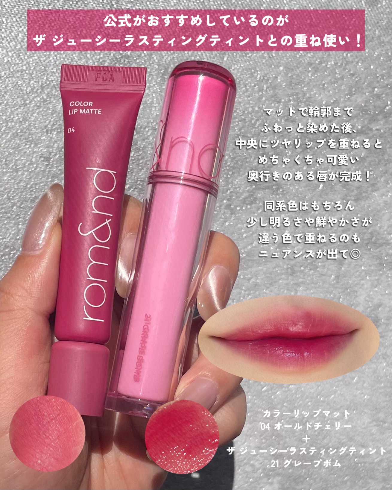 - これまで数々の人気リップを手掛けてきたrom&ndから、リッププライマーにカラーを加えた、新感覚「カラーリップマット」が登場。 チューブタイプで使いやすく、唇の縦ジワをカバーしながらふんわりと色づく、軽やかなマットリップです。1本でナチュラルに仕上げるのはもちろん、お手持ちのリップの下地としても使える万能アイテム。チークにも使えるので、流行りのリップ&チークアイテム として統一感のあるメイクに仕上がります。