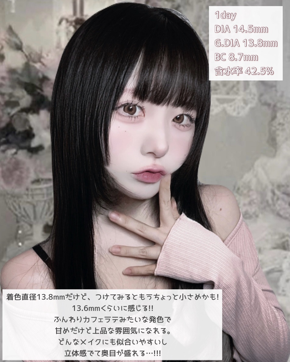 - ※2023年6月〜製品ラベルのデザインを一部変更いたします(順次切替予定)。尚これに係る商品の返品・交換等は承っておりません。 ”もっとバレずに盛れる” レンズデザインに極小ドットを採用することで、本来の瞳の色に溶け込むように馴染み、よりバレにくいナチュラルな仕上がりに。 ■パールスノーグレー(Pearl Snow Gray) ちゅるんとした絶妙グレーで透明感と抜け感のある瞳になれるデザイン。 ■テディモカ(Teddy Mocha) 甘モテ♡色っぽちゅるんオトナのミュートブラウン くりっと甘い盛り感で色気ただよう、ちゅるんな瞳 ■ミルクブラウニー(Milk Brownie) “ナチュ盛り♡ふわちゅるん”ピュアなブラウンベージュ 柔らかなミルクブラウンで甘さたっぷり、ピュアな瞳 DIA:14.5mm BC:8.7mm 中心厚:0.08mm( -3.00D ) 含水率: 38.6%(※ナチュラルブラウン、シャンパンブラウン、ナチュラルブラック) 42.5%(※アプリコットブラウン・ナチュラルモカ・クラシックチーク・クリアキャメル・パールベージュ・スムースコーラル・くぎづけの心・ひとめぼれの恋・パールスノーグレー・テディモカ ・ミルクブラウニー) カラーコンタクトレンズの不適正使用による眼障害の危険性等などがあります。 ●コンタクトレンズは高度管理医療機器です。不十分な洗浄・消毒など不適切なケアや、長時間・交換期間を超えた装用により、アレルギー性結膜炎、角膜感染症、角膜潰瘍等の重篤な眼障害が発生する危険性があります ●ご使用前に取扱説明書を確認してください 使用上の留意事項 ●眼科医院等を受診してからお求めください ●眼に異常を感じたら直ちにレンズ使用を中止し、お近くの眼科等で診察を受けてください ●医師の指示にしたがってご使用ください ●コンタクトレンズを装用する場合、自覚症状がなくても、眼科医院等での定期検査を受けてください ●レンズに不具合がある場合は使用しないでください