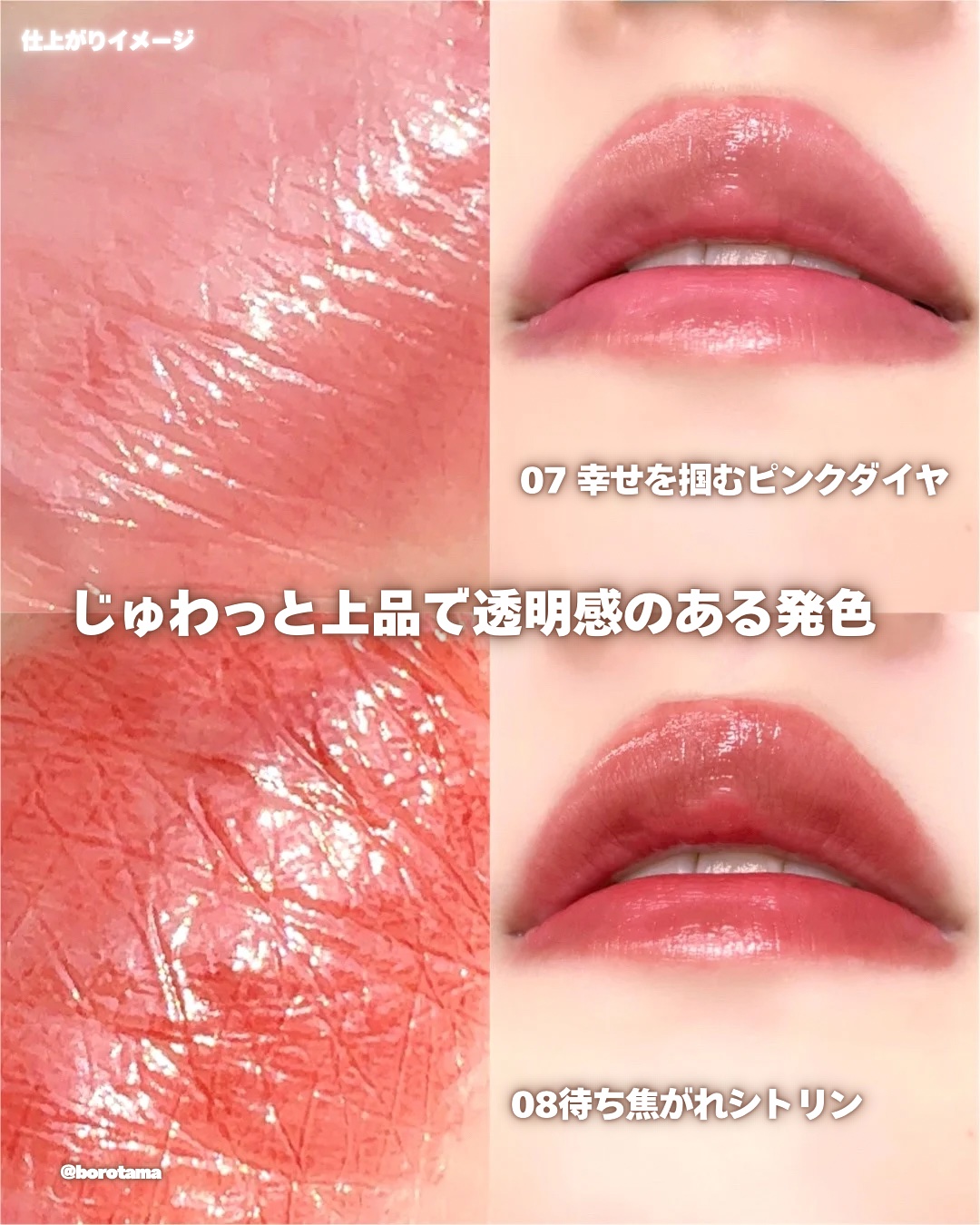 - ■チョコレートのようにとろけて宝石のようなツヤへ 植物由来のメルティングオイル※1が唇の温度でとろけだし、ツヤと血色感をスルスル広げます。 通常の3倍の水を抱え込むことができるほどの保水効果と密着性に優れたオイルが、元の唇の色を活かしながら目が奪われるような口元を演出します。 ■ツヤと発色が長時間続く! ティント処方でツヤも発色もキープし、つけたての美しさが持続します。 ■美容保湿成分配合でツヤぷる唇ケア シア脂※2、ホホバ種子油※2、グリチルレチン酸ステアリル※2、ビタミンE※3配合で、うるおいベールの膜を形成し、唇あれや乾燥を防ぎます。 ※1 ダイマージリノール酸(フィトステリル/イソステアリル/セチル/ステアリル/ベヘニル)(油性基剤) ※2 保湿成分 ※3 トコフェロール(整肌成分) 2024年8月31日(土)ロフト先行発売
