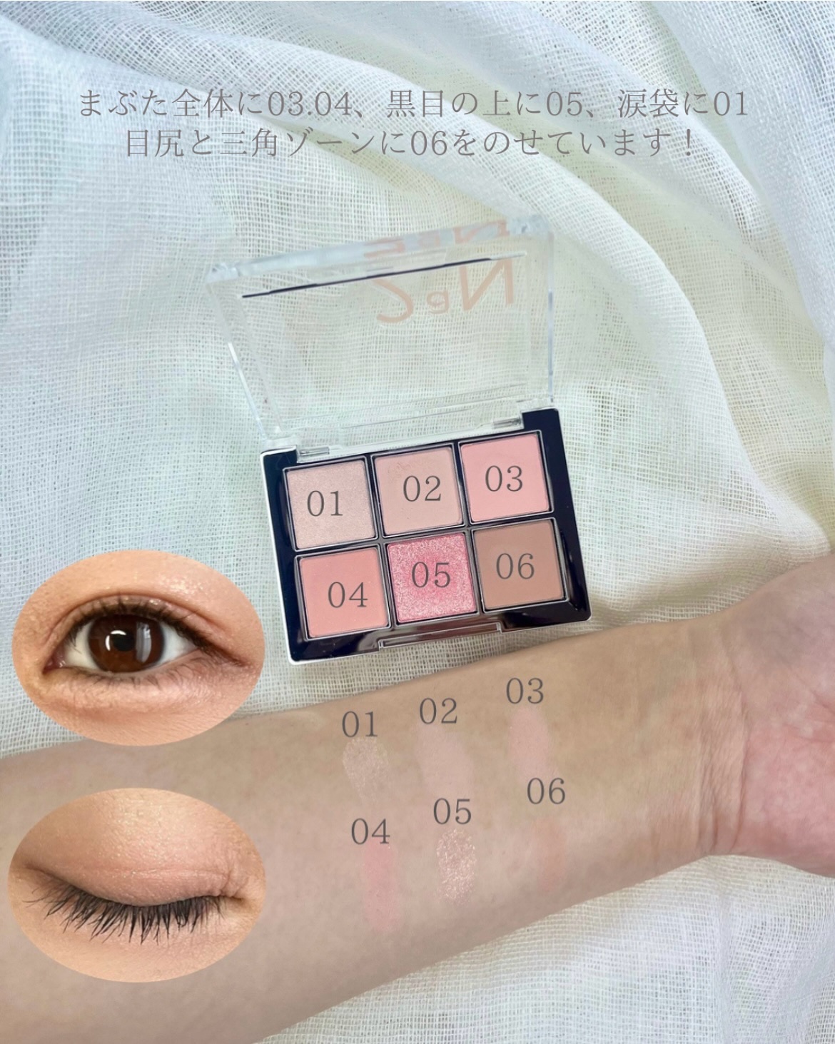 バームを下地にすることで綺麗に密着します!崩れず、まぶたに溜まることもありません。 ①②は薄づきですが、お写真4枚目は下まぶたに①と②を重ねて塗っています。ラメの主張は強くありませんがツヤ感がとても綺麗でお気に入りです♡ このアイシャドウはThe締め色という色がなく、全色メインとして使えるところが1番のお気に入りポイント!ピンクメイクとしても、オレンジメイクとしても、全色使いしても!(4枚目の写真は全色使用しています)使い方の幅が大きいアイシャドウです❤️