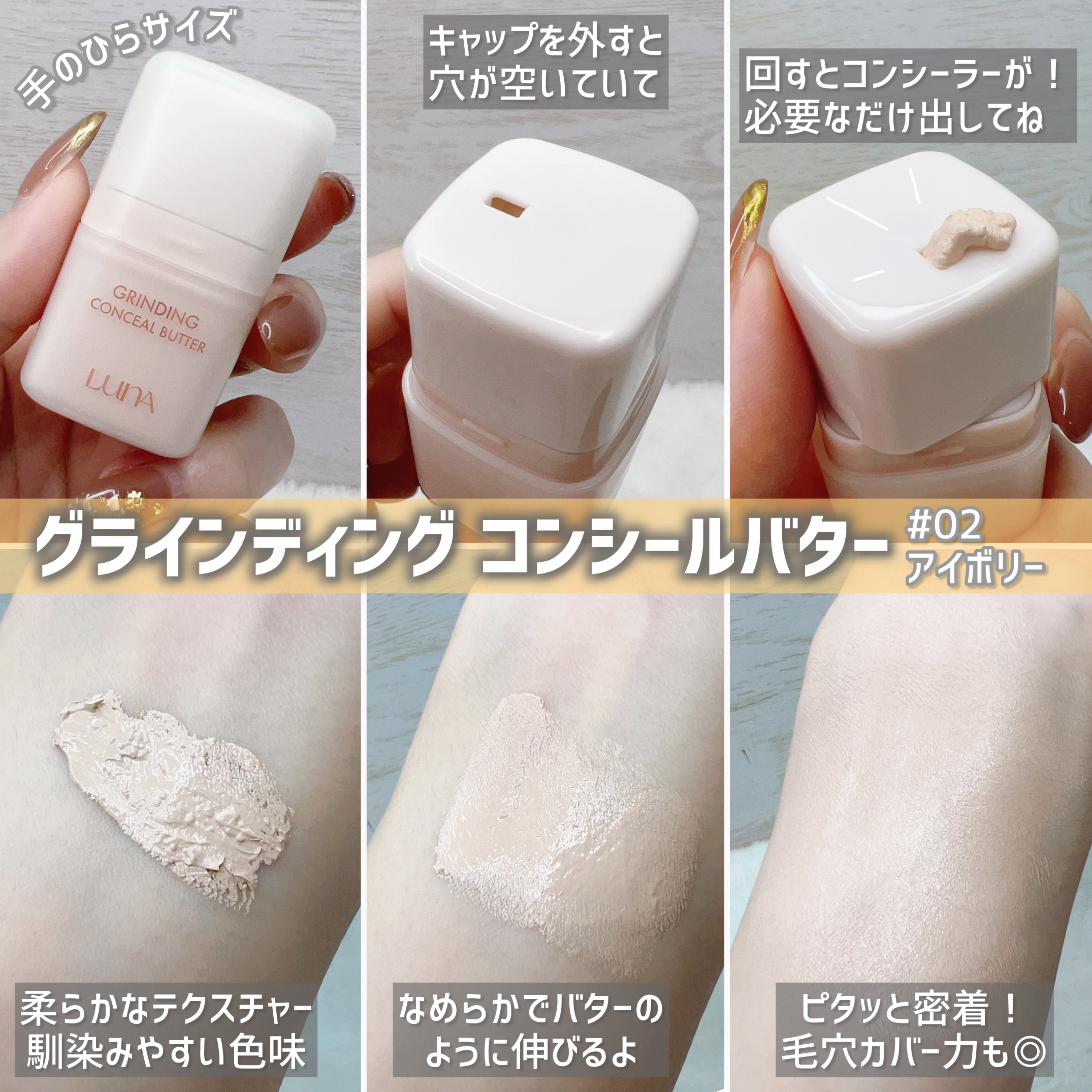LUNAの[GRINDINGCONCEALBUTTER02IVORY&GLOWLAYERBLURCHEEK12MAUVERABBIT]をご紹介🐰💗コンシーラーは回すと出てきて使う分だけ出てくる!なめらかなテクスチャーでピタっと密着。カバー力あ...