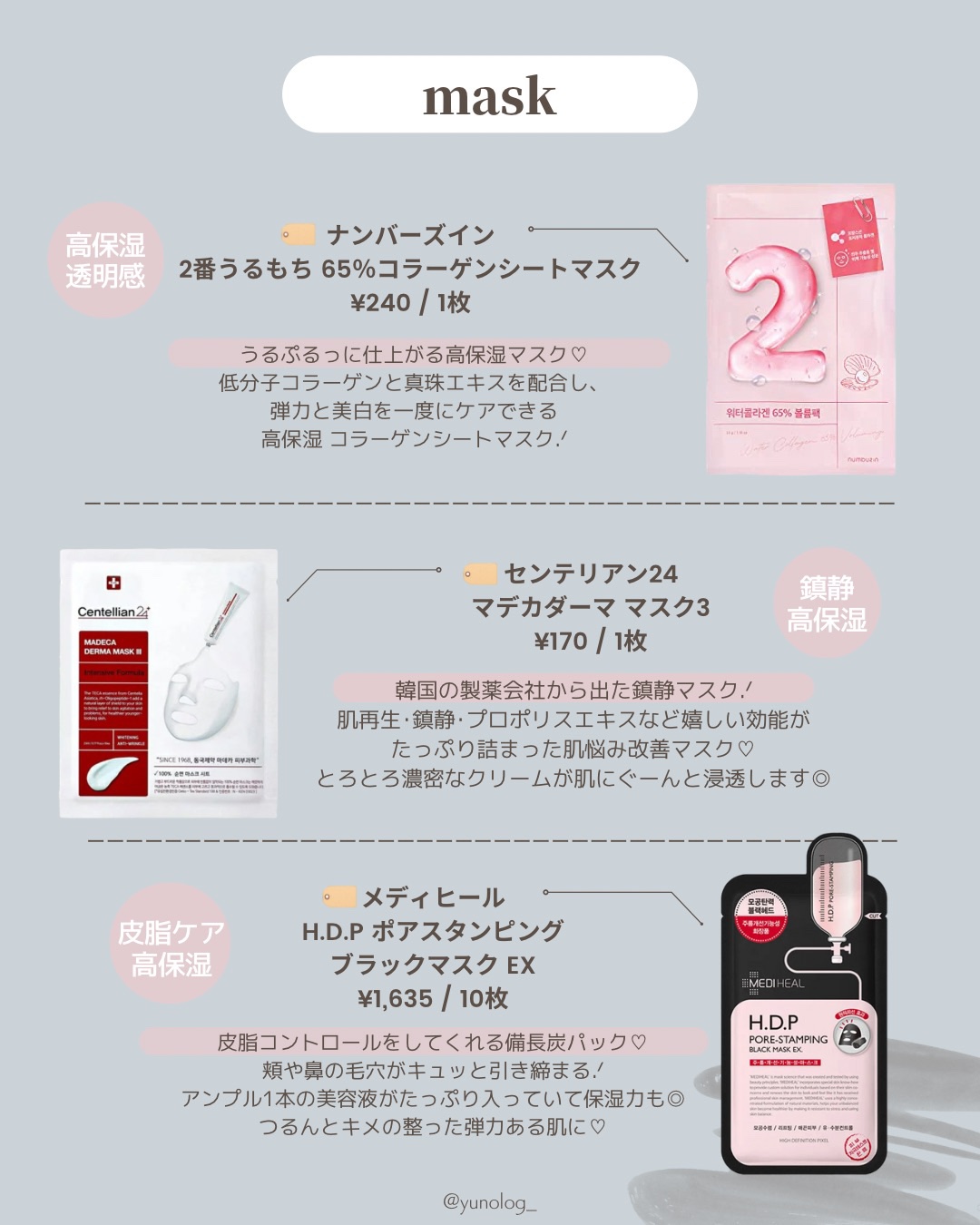 シートマスク比較③【BRINGGREEN】ティーツリーフレッシュマスク【Torriden】ダイブインマスク10枚¥275〜【ユーガ】ユーガヴィーガンドクダミシカマスク¥1,100【numbuzin】5番白玉グルタチオンCふりかけマスク1枚¥2...