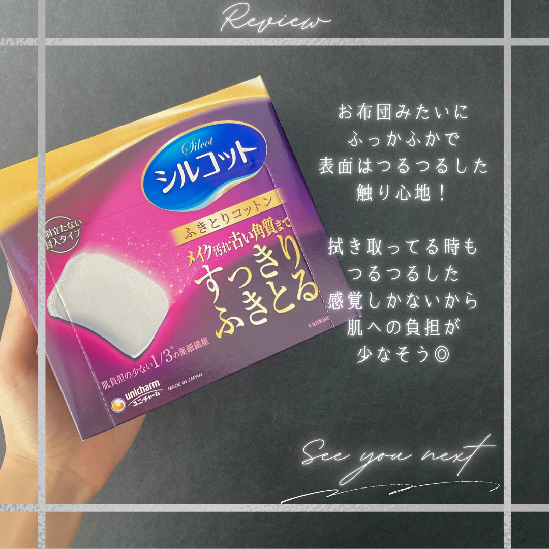 - 従来の1/3の極細繊維でメイク汚れ・古い角質もからめとる よりなめらかな表面素材で肌への密着がup ふきとりコットンの表面素材には、細くて長い「極細長繊維」を採用しています! 化粧水を含ませると、コットンがお肌に優しく密着し、軽い力でもしっかりふきとれます。