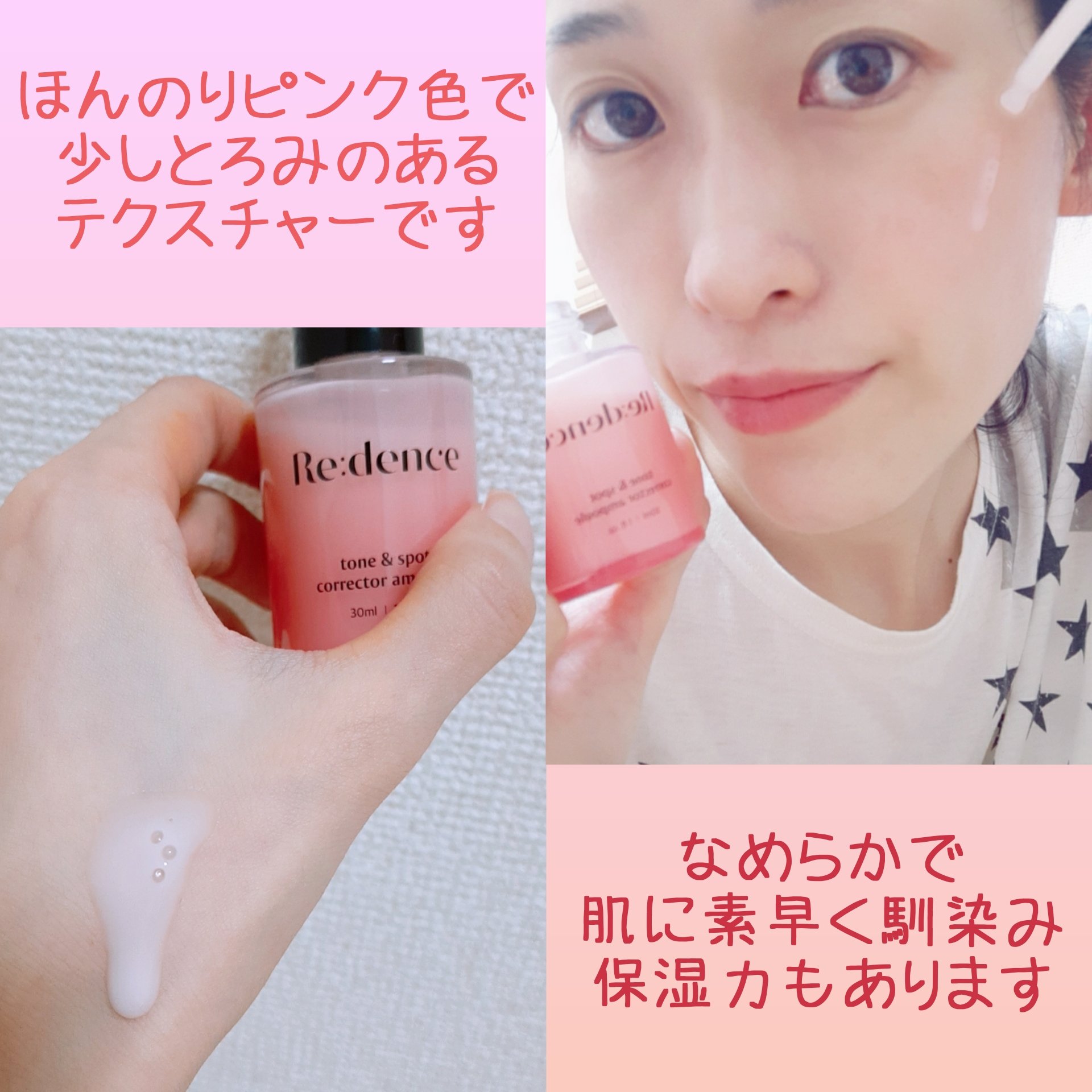 美容液はとろみのあるテクスチャーで、シートマスクは美容液たっぷりで程よい厚みがあります シートマスクは良い香りがして、スキンケア中も癒されます 肌馴染みも良く、はがした後は肌がしっとりモチモチしました