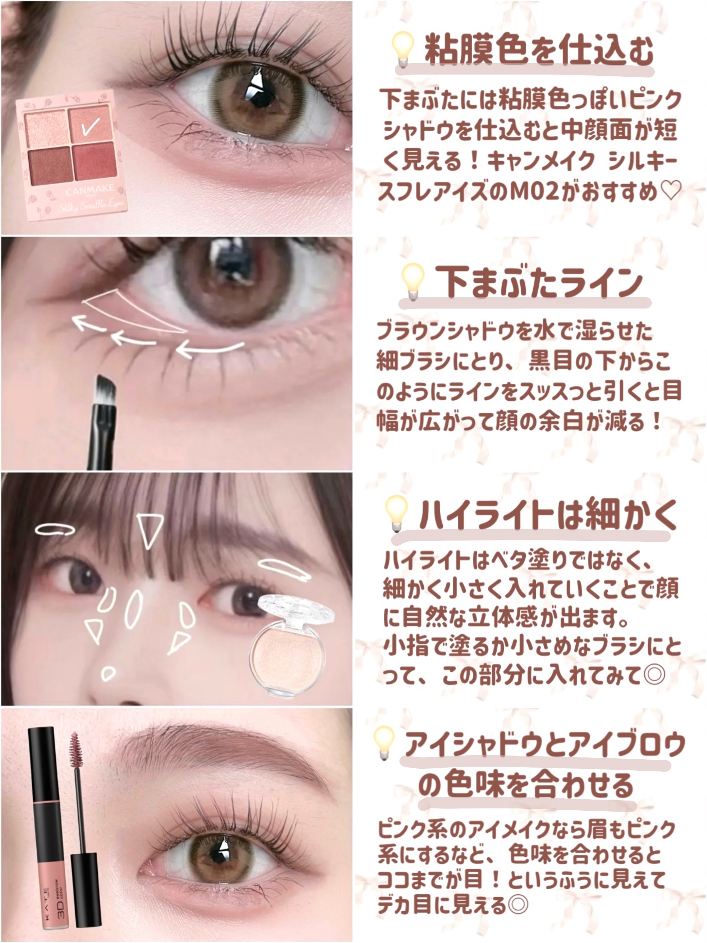 rom&nd ベターザンパレット 01PAMPAS GARDEN キャンメイク アイバッグコンシーラー 02ピンクベージュ CEZANNE ストレッチコンシーラー 30オレンジ系 これどんなに濃いクマも消える◎ やり方は画像を見てください🫶🏻 ラメを使わずに盛りたい時や、あざとく盛りたい時におすすめ!
