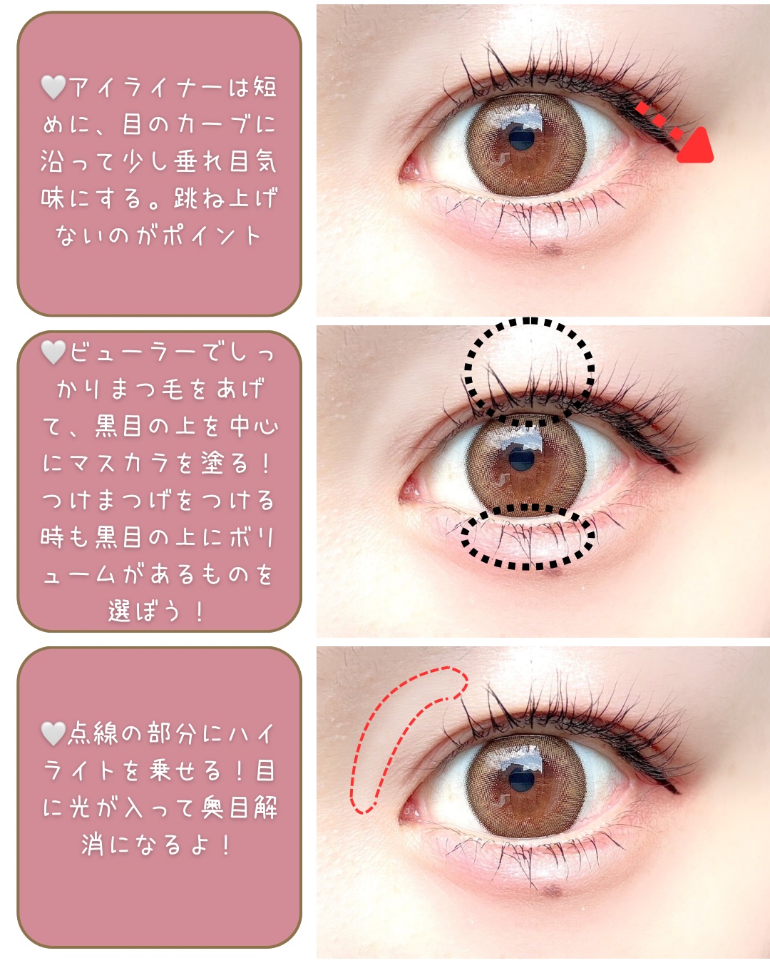 💗【ナチュラルなのに盛れる♡奥目解消メイク術】目が奥に引っ込んで見えて、目元がぼんやりしがちな奥目さん…!でも、テク次第でぱっちり大きな目元に大変身しちゃうんです✨✔カラコンの選び方✔影とラメの入れ方✔アイライン&マスカラの工夫✔涙袋&地雷ラ...