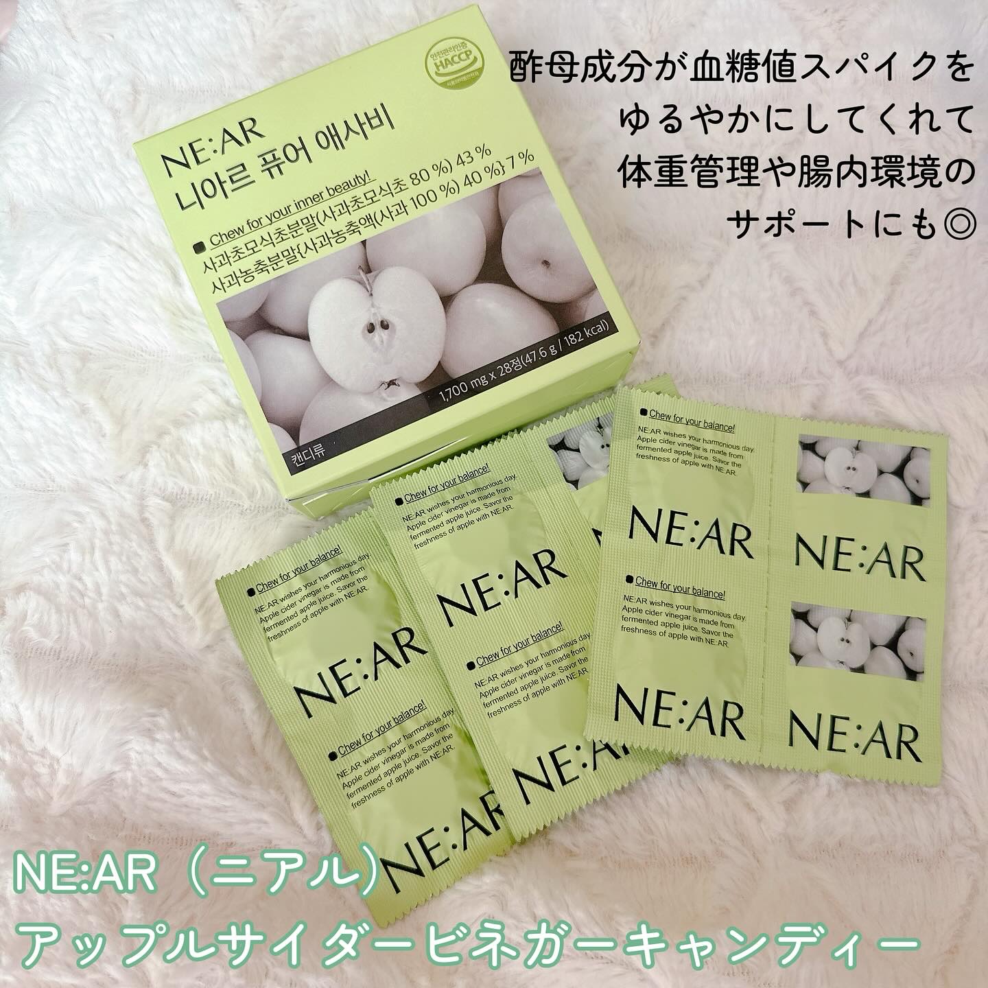 \食後の“だるい・眠い”をスッキリ解消!💡/血糖スパイクによる眠気や疲れを、ニアルアップルサイダービネガーでリフレッシュ✨🍎りんご味のキャンディタイプだから、酸っぱ過ぎなくておいしい!💊水なしOK・バッグに入れてどこでもケア韓国アイドルも愛用...