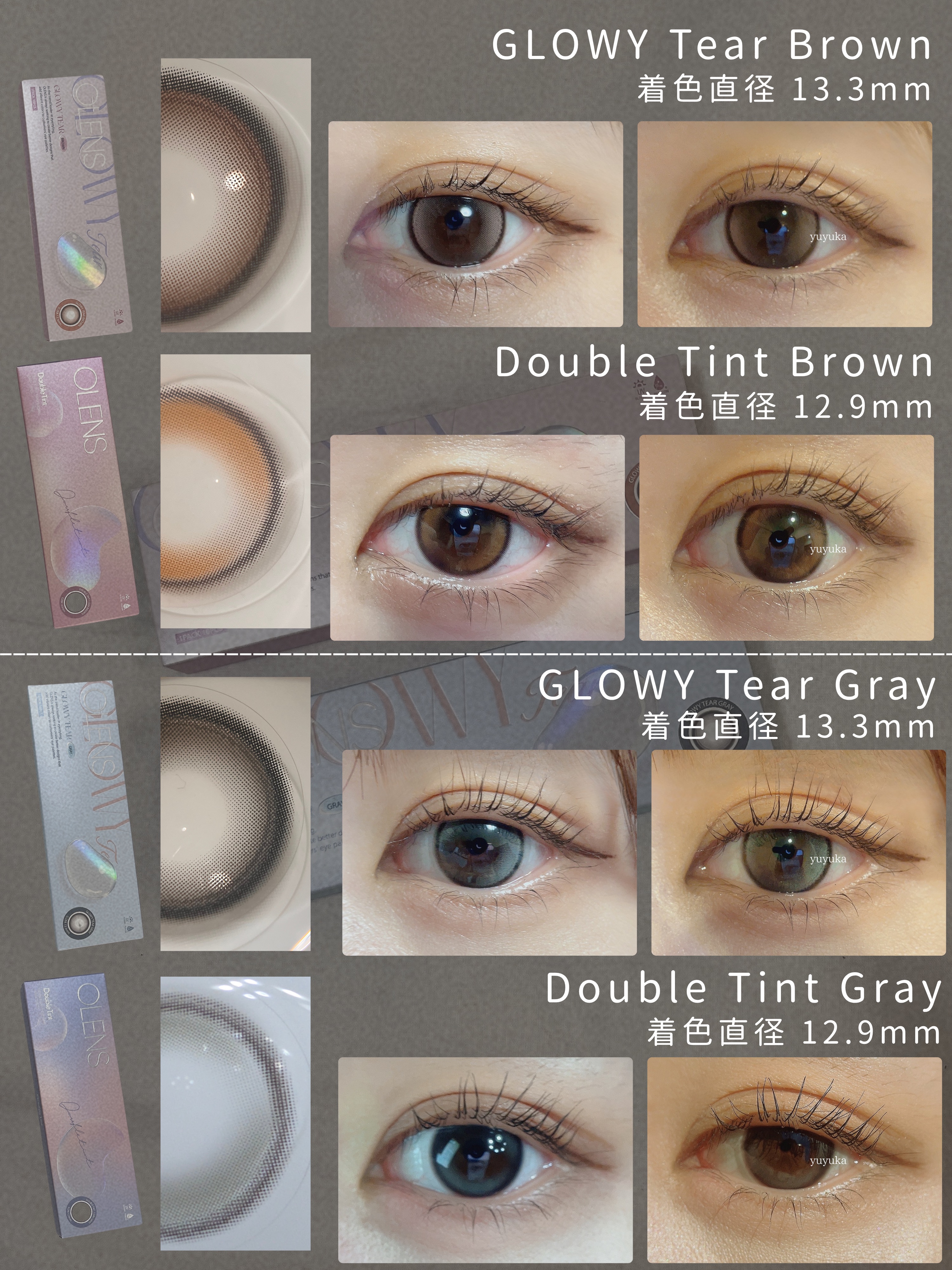 \激盛れカラコン4種比較(新作含む!)/オーレンズのDoubleTintブラウン/グレーと、新作のGLOWYTearGlowyTearブラウン/グレーを比較してみたよ!スペックはこんな感じ!▶︎DoubleTintブラウン/グレー 【スペッ...
