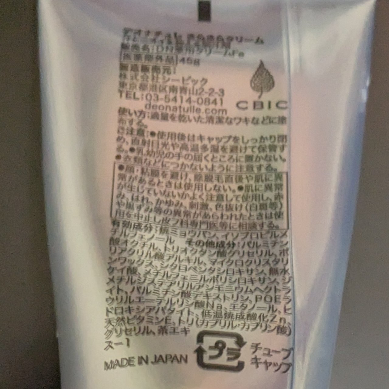 - <45g> エタノール、ヒドロキシアパタイト、シクロペンタシロキサン、パルミチン酸デキストリン、マイクロクリスタリンワックス、トリオクタン酸グリセリル、天然ビタミンE、メチルフェニルポリシロキサン、ポリアクリル酸アルキル、無水ケイ酸、ジメチルジステアリルアンモニウムヘクトライト、POEラウリルエーテルリン酸Na、低温焼成酸化Zn、トリ(カプリル・カプリン酸)グリセリル、茶エキスー1、有効成分:焼ミョウバン、イソプロピルメチルフェノール その他成分:パルミチン酸オクチル