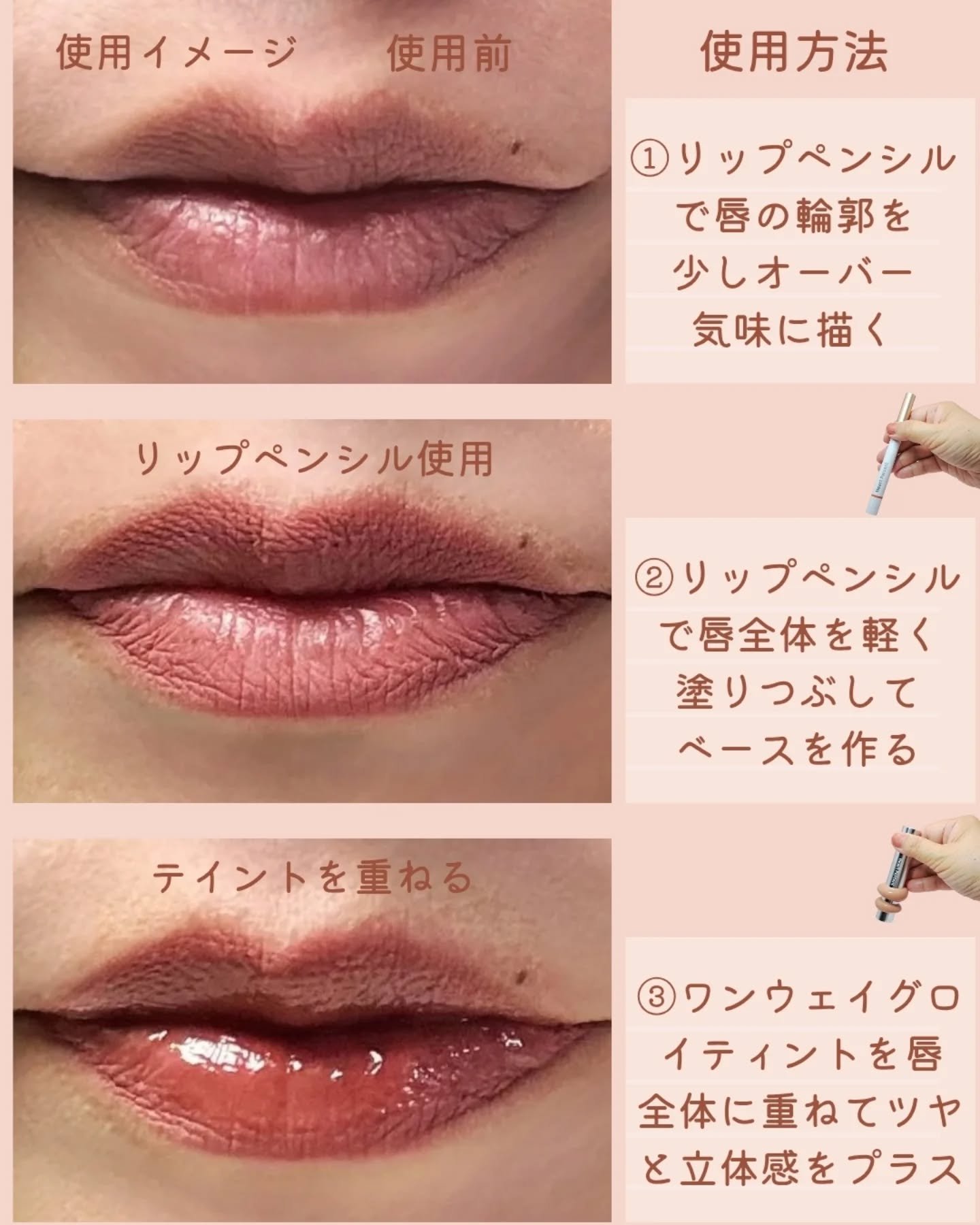 ポイント1むっちりボリュームアップ ×ツヤティントでむっちりぷるぷる唇 ポイント2大変柔らかく1度繰り出したら戻らないので1ミリ程度繰り出して優しく塗って ポイント3新色06は甘い雰囲気を添えるモーブピンク 青みがかったピンクが可愛い