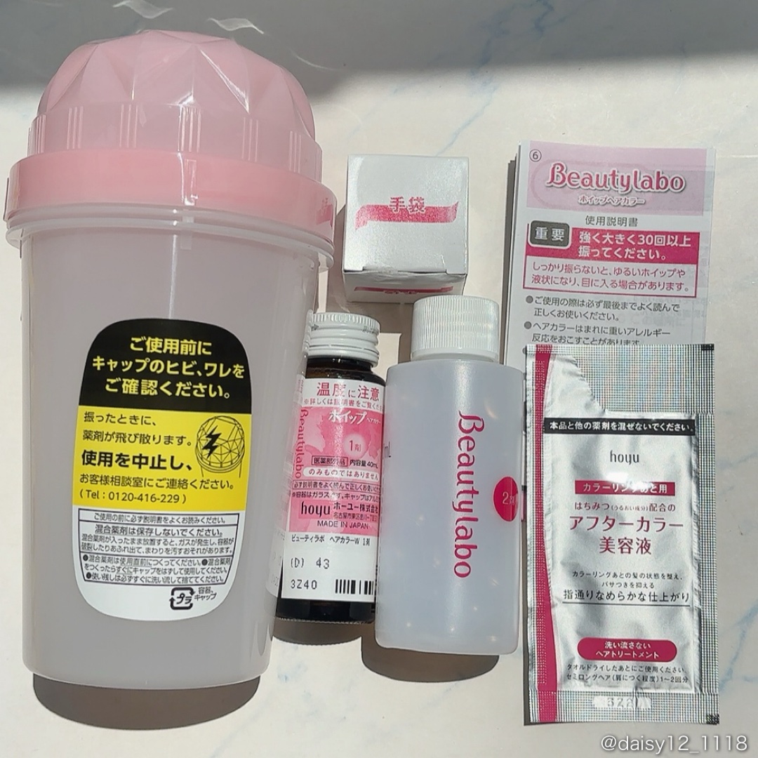 - <医薬部外品> ●髪にうれしい3つの成分が「うるおい つややかな髪色」に導きます うるおい成分(はちみつ&植物・果実成分) 色持ち成分(W アミノ酸=テアニン・タウリン) 毛髪保護成分(ポリ塩化ジメチルジメチレンピロリジニウム液) ● 使い方カンタン。シェイカー容器で一度にホイップを作れるから、あとはすくって塗るだけ ●もっちり濃密なホイップで、ムラになりにくくキレイに染まる ● 全18色のカラーバリエーション 「ナチュラルライン」と「ニュアンスライン」、2つのカラーラインナップから選べます ● アフターカラー美容液つき パッケージ内容:1剤、5剤、シェイカー容器、手袋、使用説明書、アフターカラー美容液