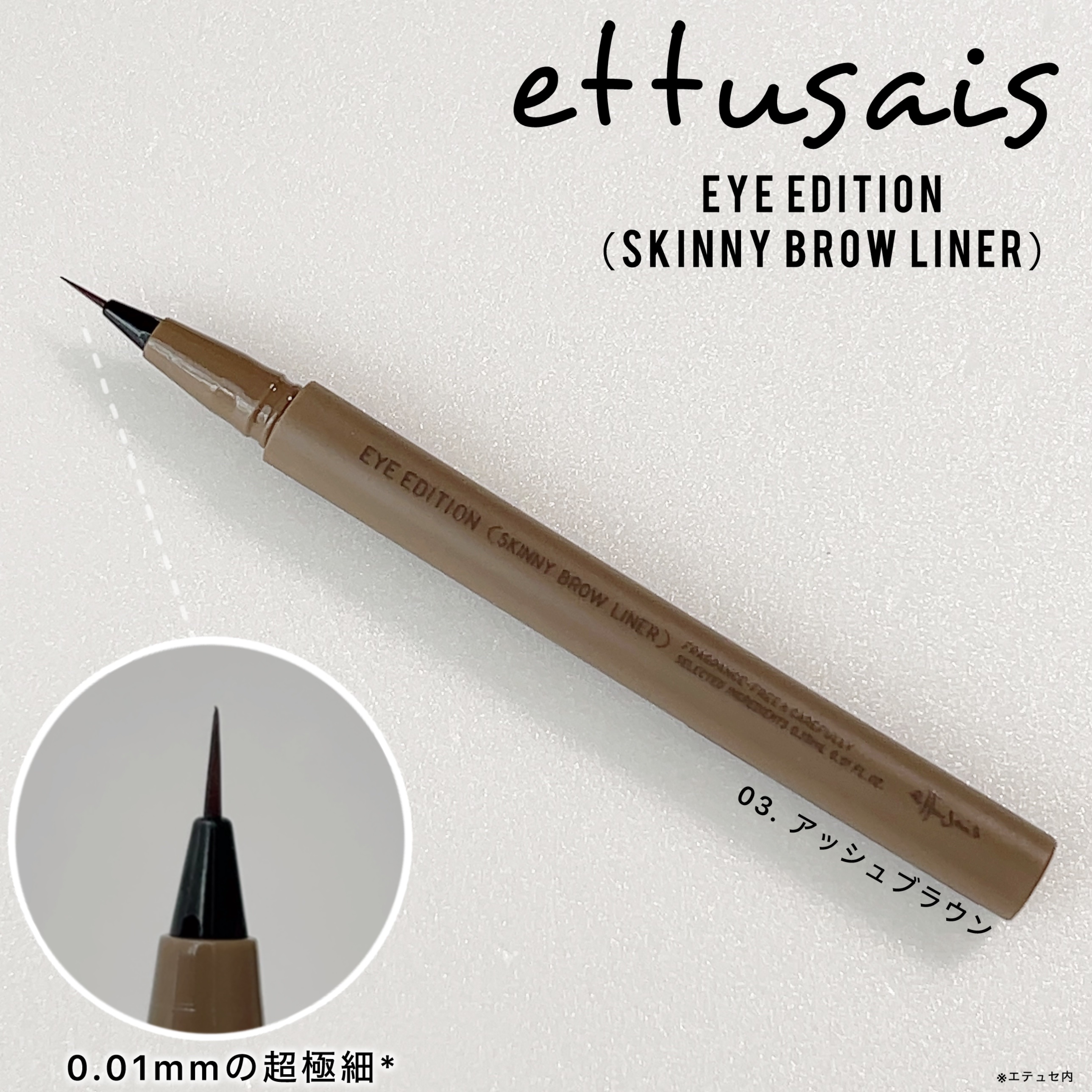 - 0.01mmの超極細*ラインで簡単に仕上がる眉尻ライナー ○自眉のようにリアルな線で眉尻の先まで簡単に描ける、ブレにくい超極細*筆。 ー驚異の0.01mmの超極細*ラインを実現する独自の技術を採用。 *エテュセ内 ー通常の筆よりも短い筆丈 ー職人による手組み×専用設備で仕上げた高品質な筆 ー厳選した2種の毛を混毛 ○絶妙な発色で、濃すぎず薄すぎない自然な仕上がり。 ○ウォータープルーフ ○汗、皮脂、こすれに強く、美しい仕上がりが長時間持続。 ○美容液成分配合 ー保水成分(ヒアルロン酸) ○無香料 ○アレルギーテスト済(すべての方にアレルギーが起きないというわけではありません)