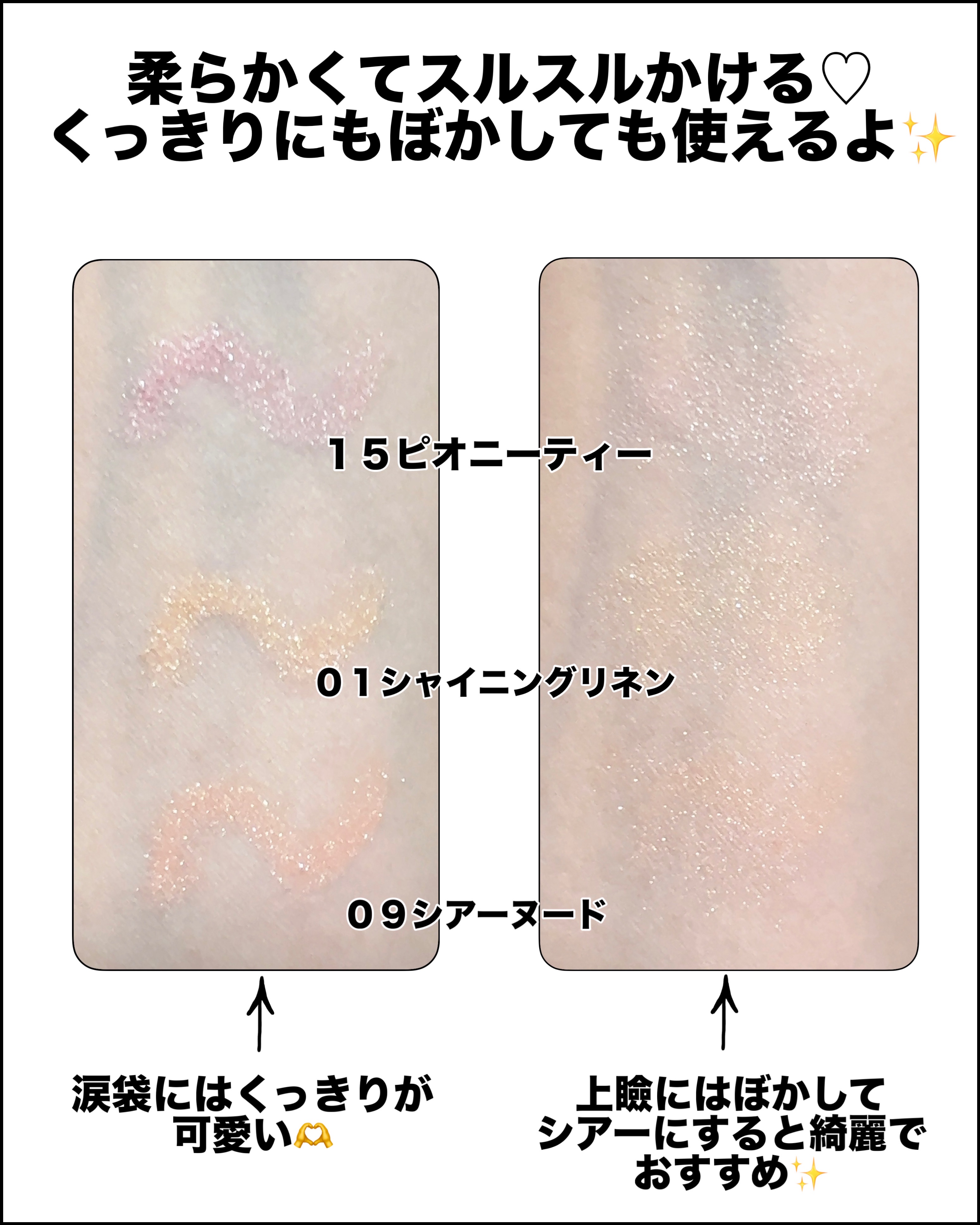涙袋に使うとぷっくりうるうるになります 🥹 シアーヌードは肌なじみがいいので、自然な涙袋になるのがお気に入りです !! メイクキープミスト等をするか持ち歩いて塗り直すのがいいかもしれないです 🤔 専用のシャープナーも付いてます 🙆🏻♀️ どれを買うかで悩んでる方は09 がオススメです !! 気になった方はぜひ買って見てください !!
