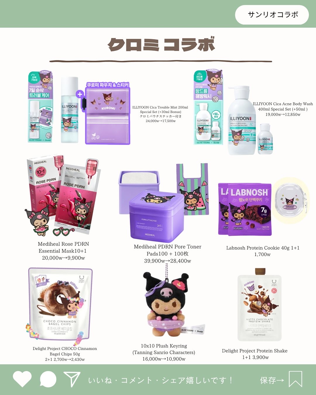 サンリコラボ、全部コレクションしたい😍 商品だけならすでに持ってるものも多いけど、コラボパッケージが可愛くて私は思わず衝動買いしちゃいました💕 クロミコラボが多くて幸です❤︎