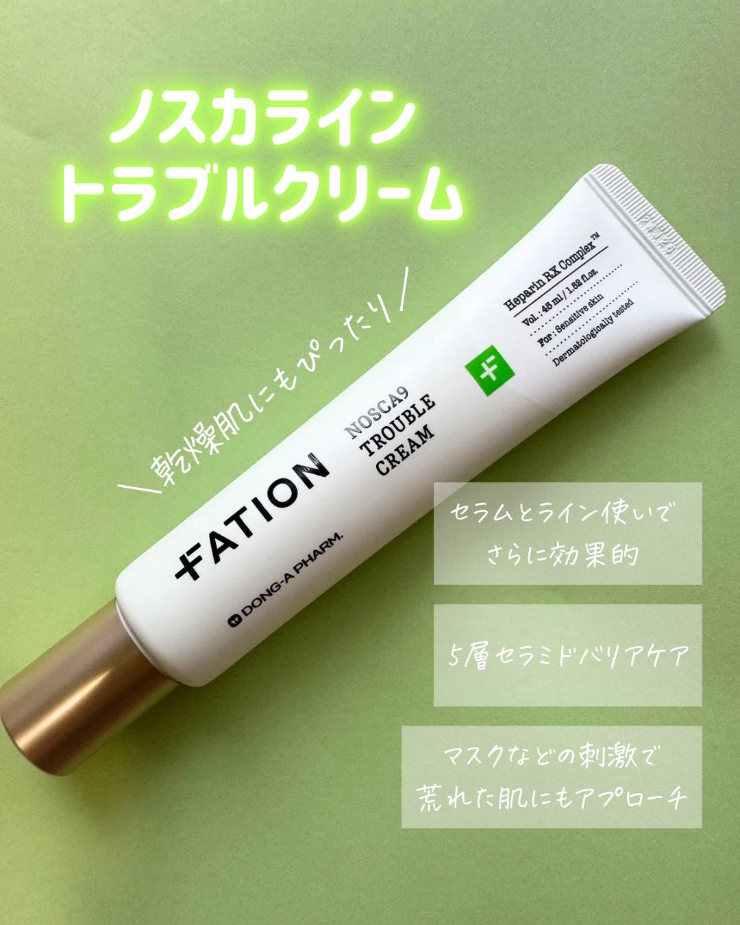 90年を超える韓国 TOPの製薬会社【東亜製薬】で9年間研究開発して作られたFATION のノスカナインライン 9年間研究した 東亜製薬の特許うるおい成分46% なめらかなクリームのテクスチャーでのびもよく、しっとりとしたつけ心地♡