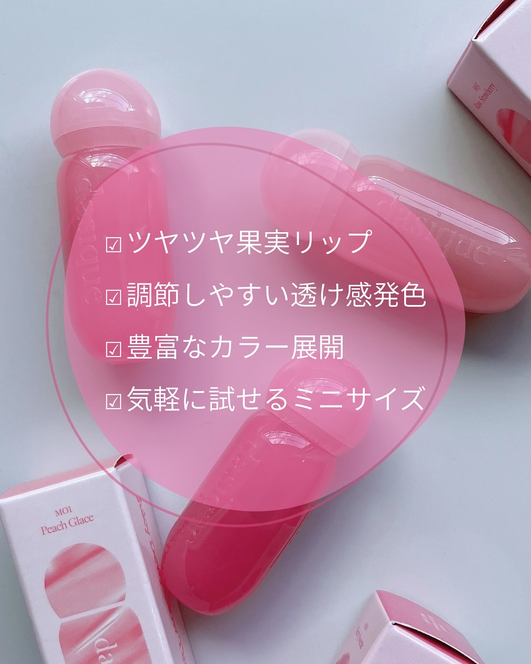 うるちゅる🍒🍯特別なミニ限定カラー🎨dasiqueジューシーデューイグロウティントミニはちみつに漬けた果実のような、うるちゅるな仕上がりが可愛い💗ベタつかない軽いつけ心地とリップグロスを重ねたようなツヤ感に加え、色残りもしっかり。大人気のグロ...