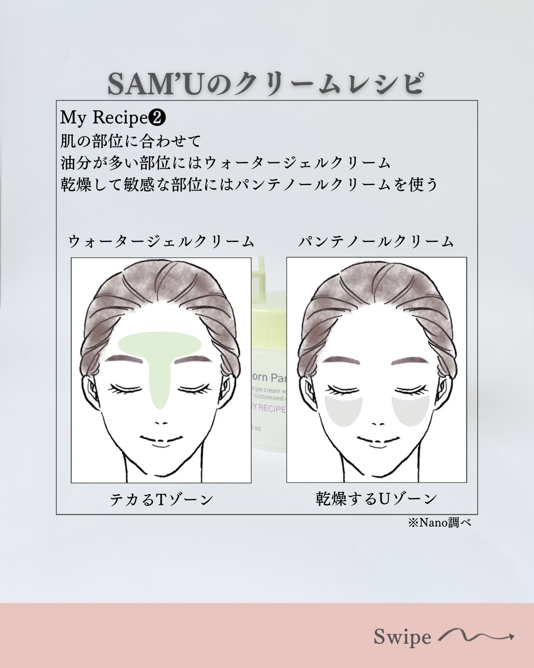 - 毎日変わる肌のコンディションに合わせて自分だけの肌レシピを作れるカスタマイズクリーム うるおいたっぷりのウォータージェルクリームと水分補給&生き生きとした肌印象に導くパンテノールクリームで同時にダブルケアができるこだわりアイテム。 べたつきなく柔らかいテクスチャーの2つのクリームが肌のコンディションを整え、もちっとハリ感のある肌へと導きます。 [使い方] 1)洗顔後、化粧水や美容液で肌を整えた後に、スパチュラで肌のコンディションによって、ウォータージェルクリームとパンテノールクリームを適量を取り、 混ぜ合わせてから顔全体に優しく塗り伸ばします。 *毎日変わる肌のコンディションに合わせて、乾燥が気になる時はウォータージェルクリームを、敏感に傾いた肌を整えたい時にはパンテノールクリームの量を多めにMIXして使用するのがおすすめです。