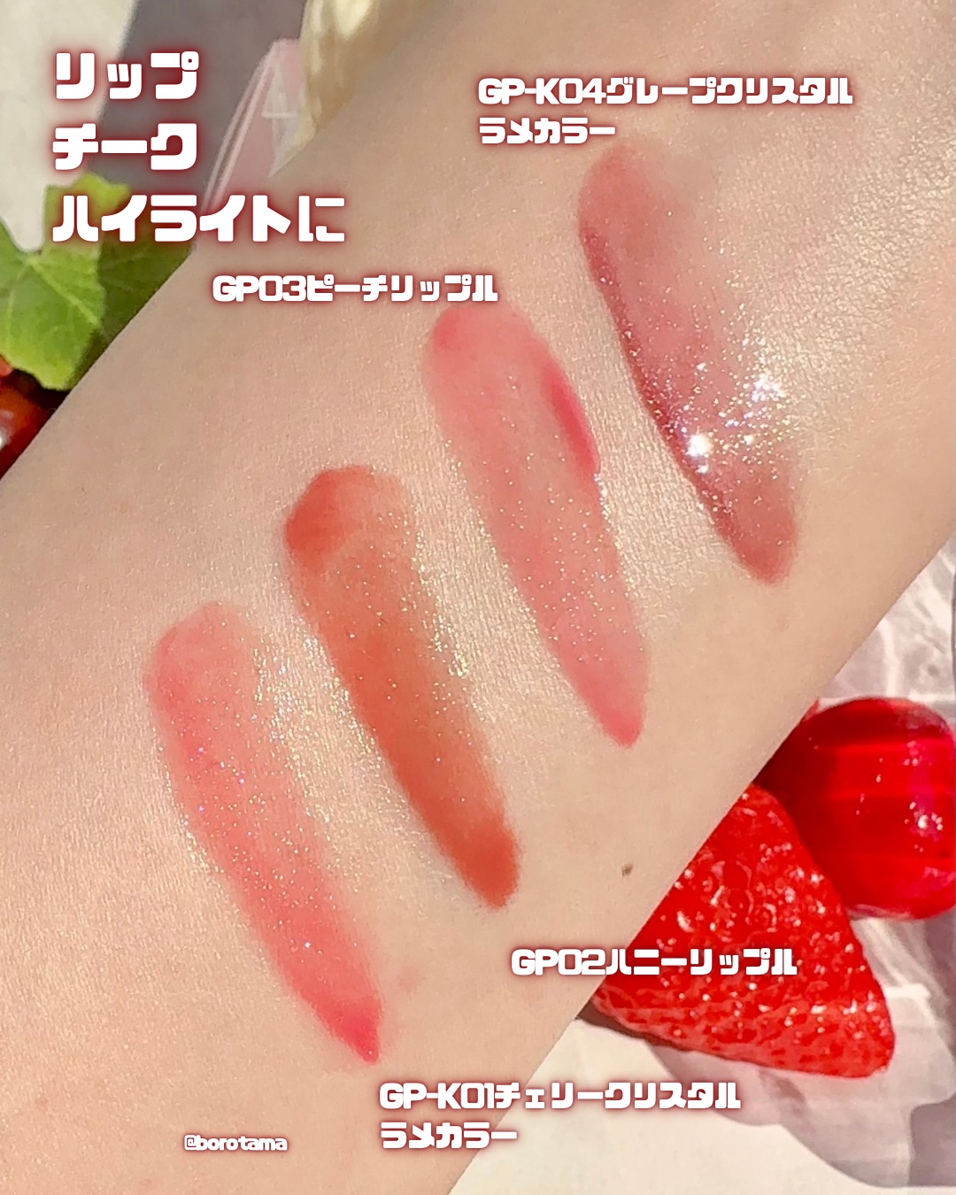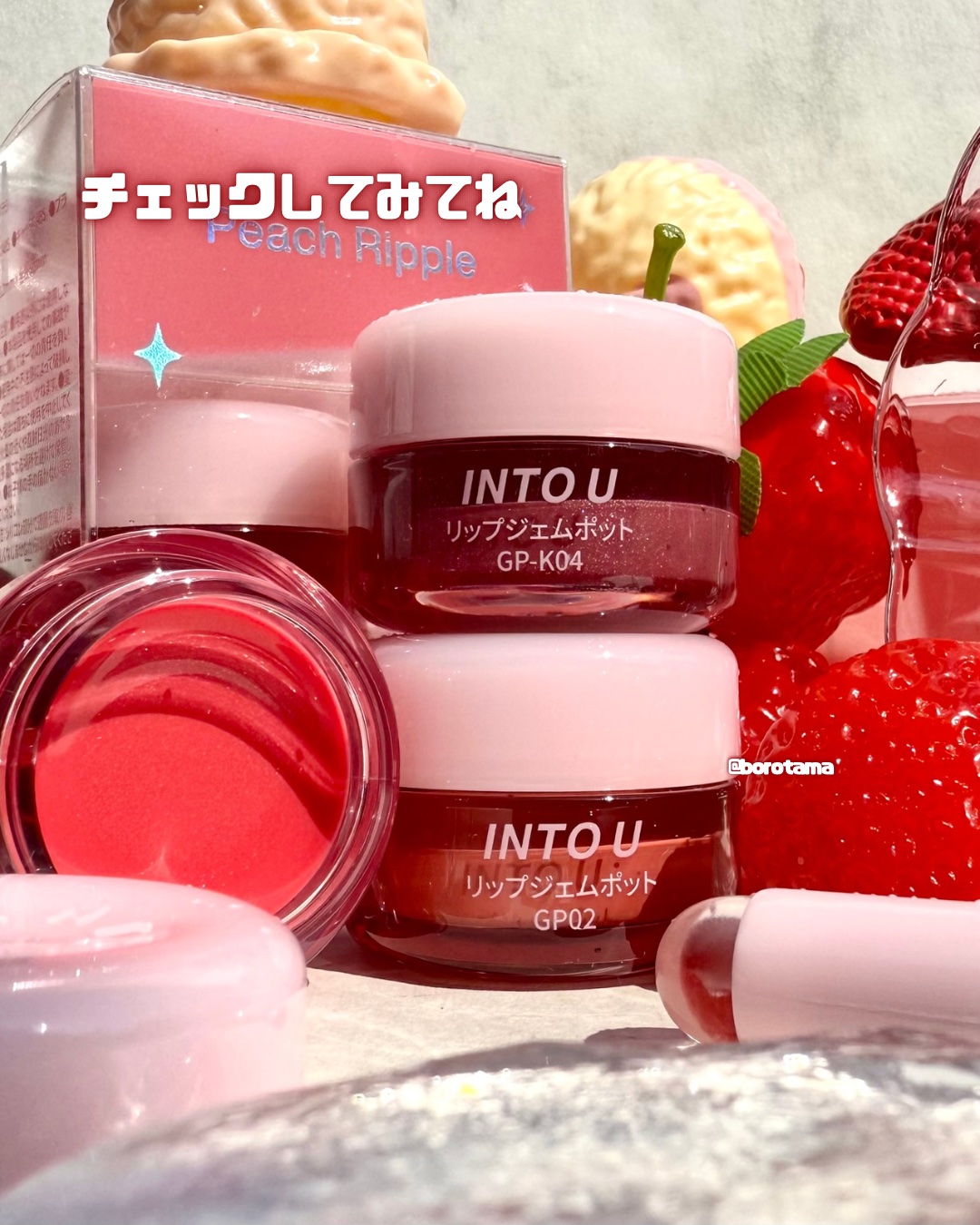 INTOUリップジェムポット[数量限定]全4色❤️チェリークリスタルGP-K01クリアなチェリーピンクに繊細なシルバーラメが入っていて、ほんのり色づいて可愛いです🤎ハニーリップルGP02どんな肌タイプにも合うハニーベージュカラー肌なじみの良い...