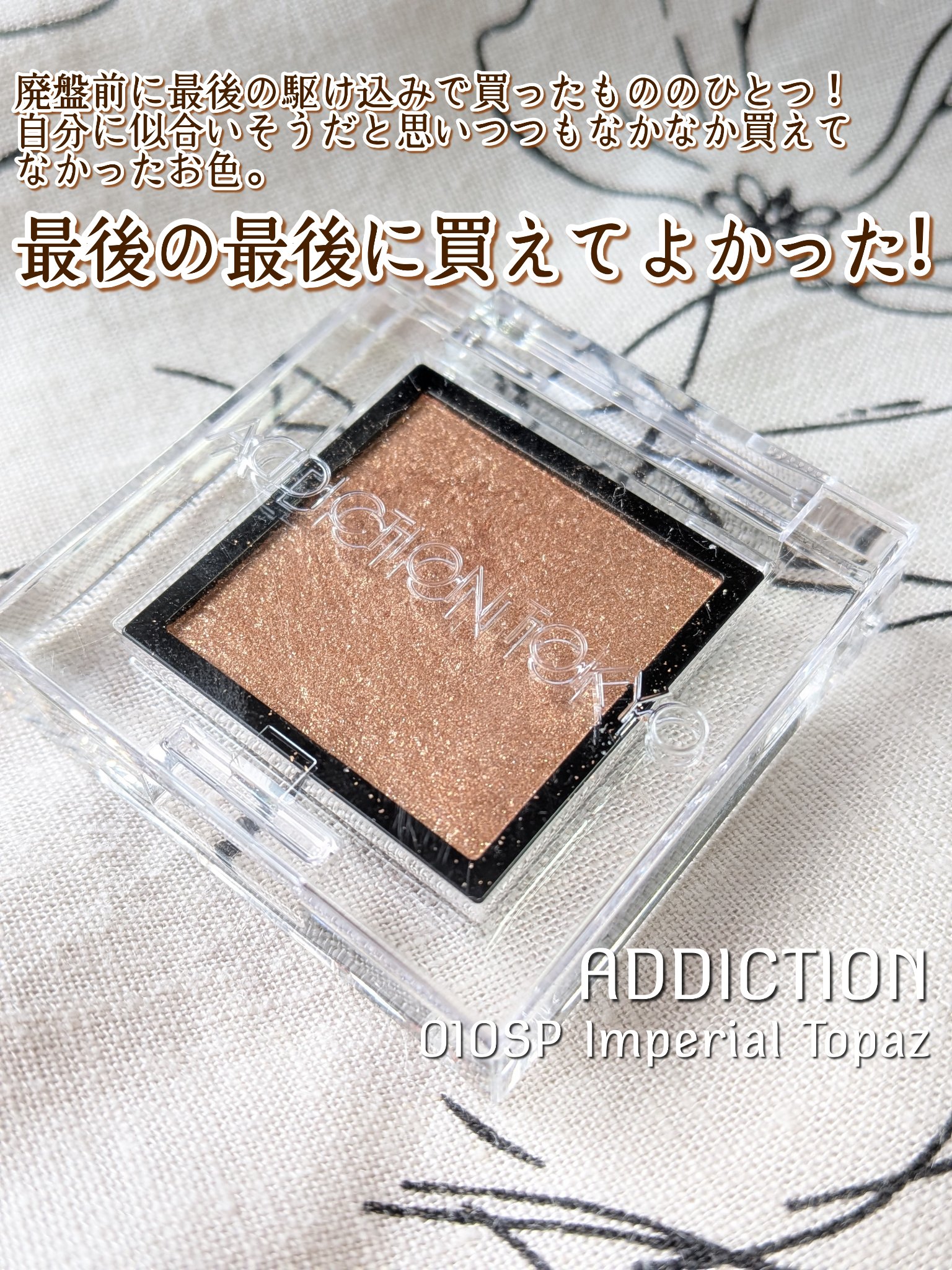 ADDICTIONアディクションザアイシャドウスパークル004SPMariage マリアージュ010SPImperialTopaz インペリアルトパーズマリアージュはシャンパンカラーにまばゆいラメラメがざっくざくで加減しないと目元が大変なこと...