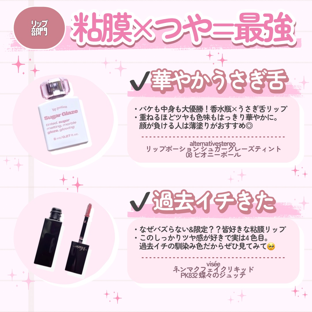 | リップティントランキング第3位 | 重ねて塗っても、ちゅるんと透け感が残って明るめカラーがとっても映える…💕色残りも◎ | 詳細を見る | ||