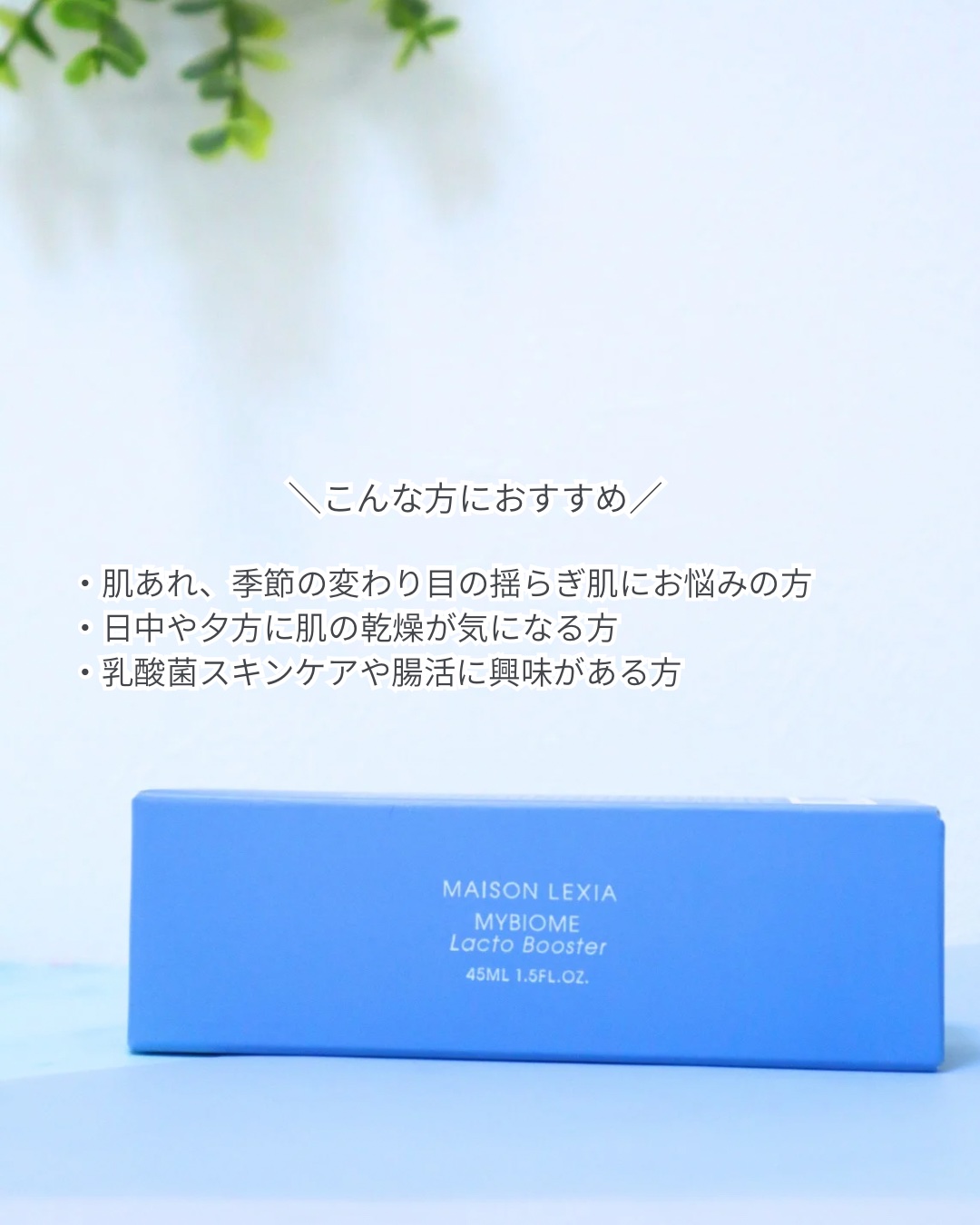 メゾンレクシアの導入美容液『マイバイオームラクトブースター』で菌活を始めました🌿自社農園で育った絶滅危惧植物“ヤチヤナギ”由来の植物性乳酸菌を用いたプロダクト。肌のキメや乾燥、ゆらぎにアプローチできる優れもの🕊ラクティックハーバル調のすっきり...
