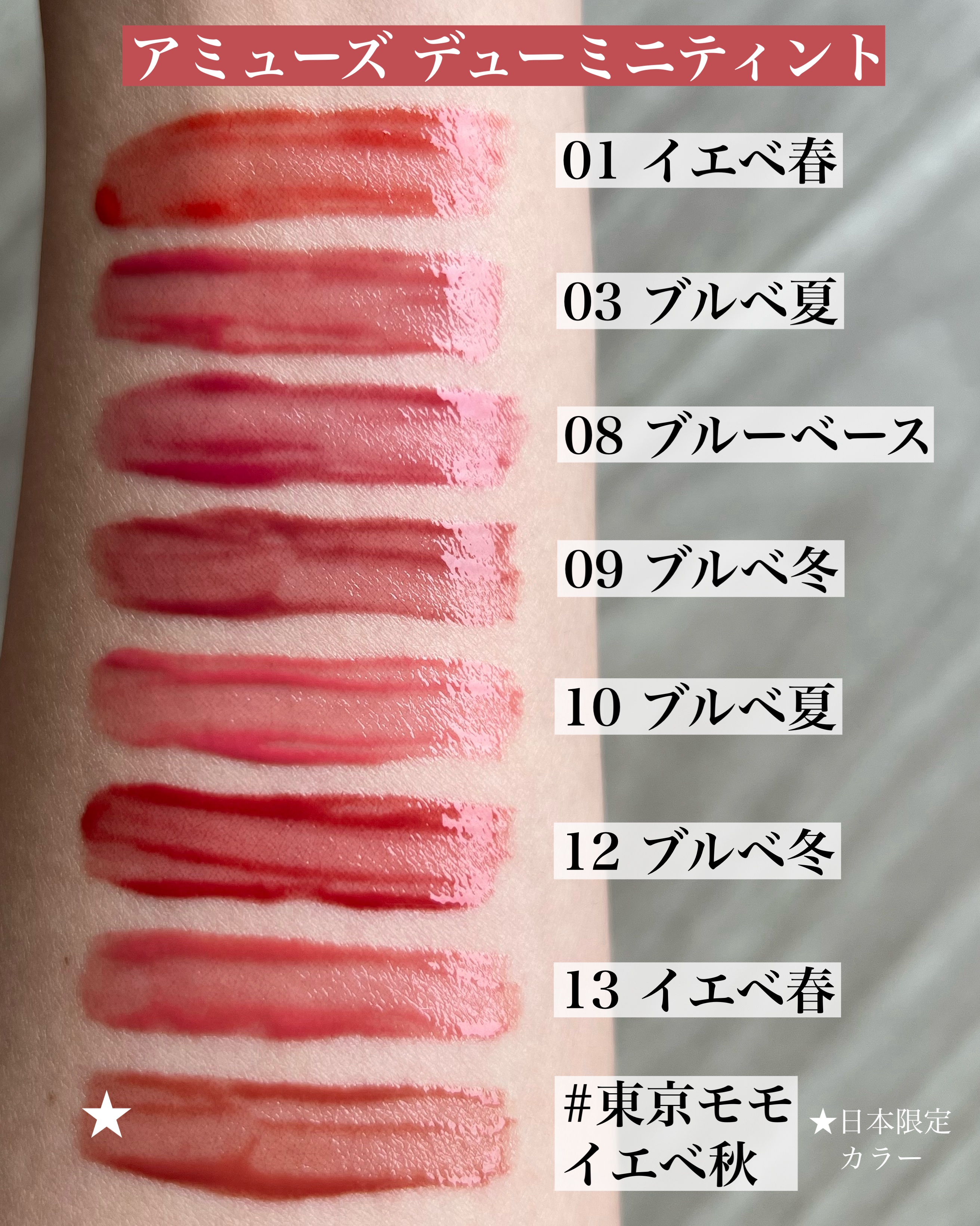 もーーーまずパッケージが可愛すぎるよね😢❤️❤️ 迷いなく全色買ってしまったよ…! 既存のジューシーラスティングティントに比べて ⚪︎サラッとしたリキッド ⚪︎やや薄づきな発色⚪︎艶々? 個人的にはロムアンドでは 最近こそ出るようになったけど ブルベ向きのカラー(特にサマー)でドンピシャが あんまり無いなあと思っていたので、 今回とっっても5〜8番が可愛くて ひじょーーーーーーに!満足しております💪❤️❤️