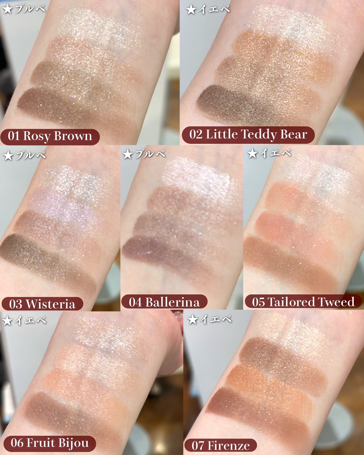 コレはモテ確定のアイシャドウと私の中で決定した 左上: 偏光パールがチラつく珍しいピンクカラー 右上:ホワイトやピンクのラメが煌めくカラー 真ん中: 柔らかいパール入りのベージュ 左下:シアーな赤。少し温かみのあるコーラル感も感じます 右下:マットカラーの赤みのあるブラウン これはね、動画でも伝わらないぐらいラメが繊細で可愛いんだよね😍 女の子らしさが溢れんばかりの儚げピンク💗