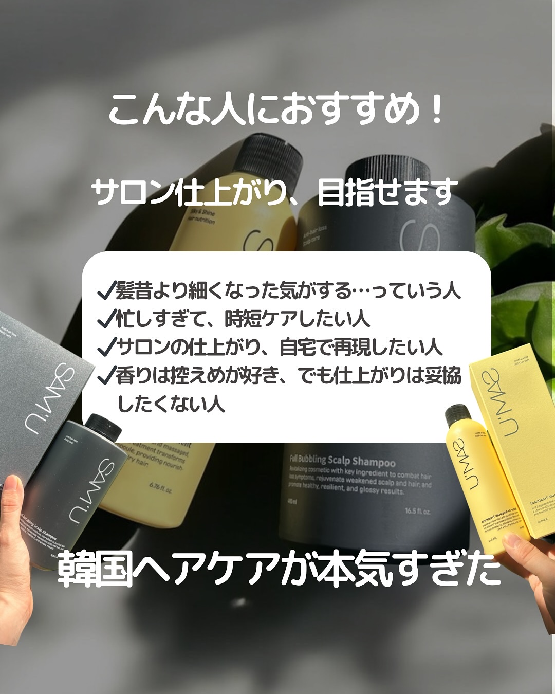 \髪と頭皮にたっぷりの栄養を/韓国高級サロンでも使われているSAM'UのヘアケアラインSAM'Uフルバブリングスカルプシャンプーウォータートゥーアンプルトリートメント《商品特徴》♥フルバブリングスカルプシャンプー✔︎たっぷり濃密テクスチャーの...