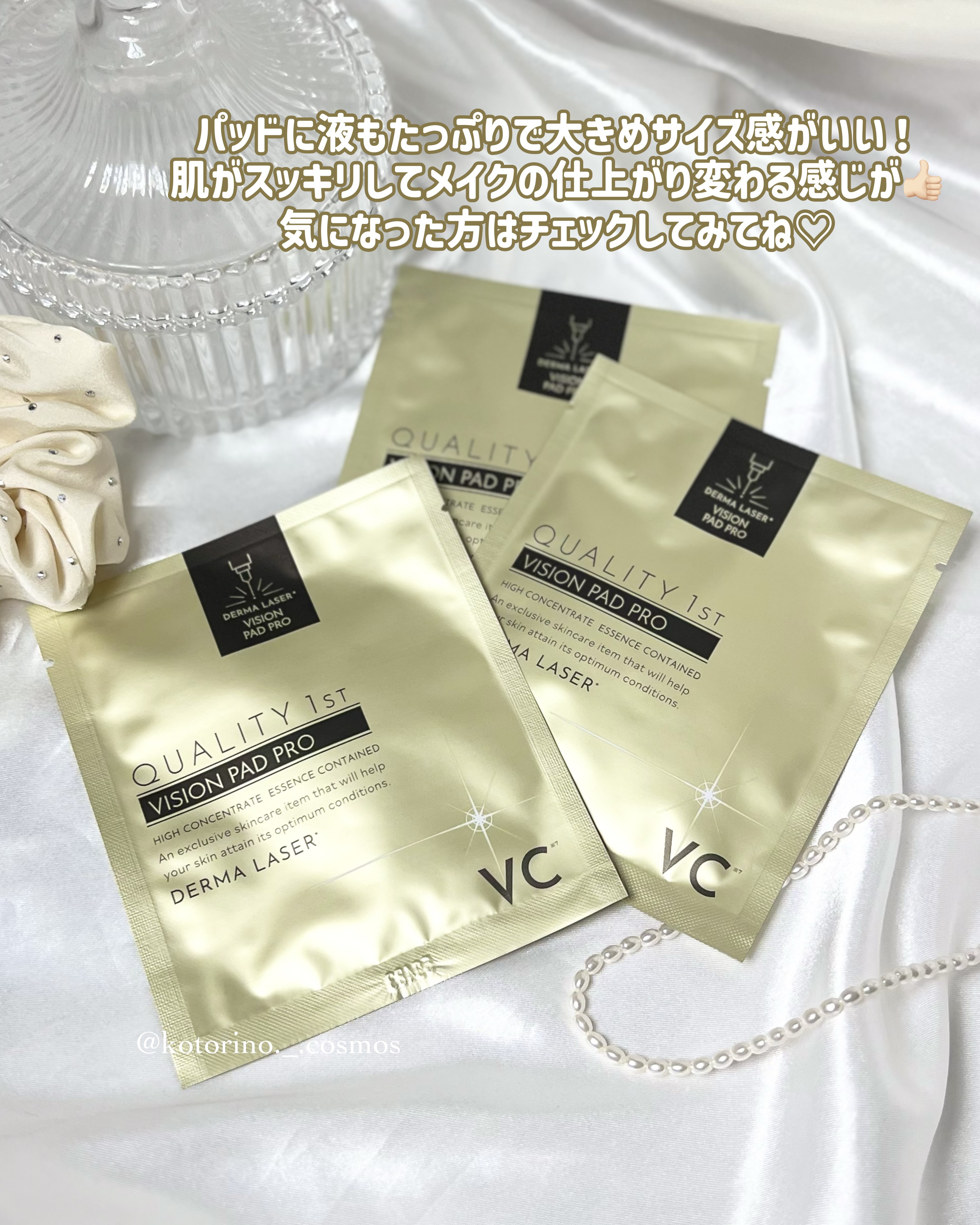 - 【全方位美肌*1パッド ダーマレーザー ビジョンパッド PRO】 特別な日に、拭き取ることで全方位美肌*1を考えた、毛穴美容液拭き取りパッド。 気になる角栓を溶解*2し、仕上げに渾身のツヤを与えることで、毛穴*3やくすみ*4、黒ずみ*5をケアして、高解像度の撮影にも耐えうるキメの整った全方位美肌へ。 女優やモデルが撮影現場で求められる肌のような仕上がりを感じられるパッドです。 ●角栓除去繊維×古い角質柔軟成分 マイクロファイバーとPHA(マンデル酸:整肌)が毛穴にアプローチ。汚れや古い角質を溶解*2します。 ●超解像のキメ!徹底的に全方位美肌*1。7種類のビタミンC*6 拭き取りだけで浸透*7する7つのビタミンC*6が全方位美肌*1へ徹底アプローチ。さらに日中使用可能なレチノール(バクチオール)*8も配合。 ●渾身のツヤを与える、高純度*9プラチナエキス*10 高純度プラチナエキスが発光するようなツヤを与えます。 ●防腐剤フリー ●アルコール(エタノール)フリー ●合成着色料フリー ●香料フリー ●鉱物油フリー *1キメが整ったお肌 *2汚れを落としてお肌を清潔にすること *3潤いを与え、毛穴の目立ちにくいなめらかなお肌へ *4乾燥によりくすんで見えるお肌に潤いを与え、明るい印象に導く *5汚れのこと *6アスコルビン酸、パルミチン酸アスコルビルリン酸3Na、リン酸アスコルビルMg、テトラヘキシルデカン酸アスコルビル、ビスグリセリルアスコルビン酸、3-グリセリルアスコルビン酸、3-O-エチルアスコルビン酸(すべて整肌成分) *7角質層まで *8保湿成分 *9クオリティファーストとして *10コロイド性白金(整肌成分)