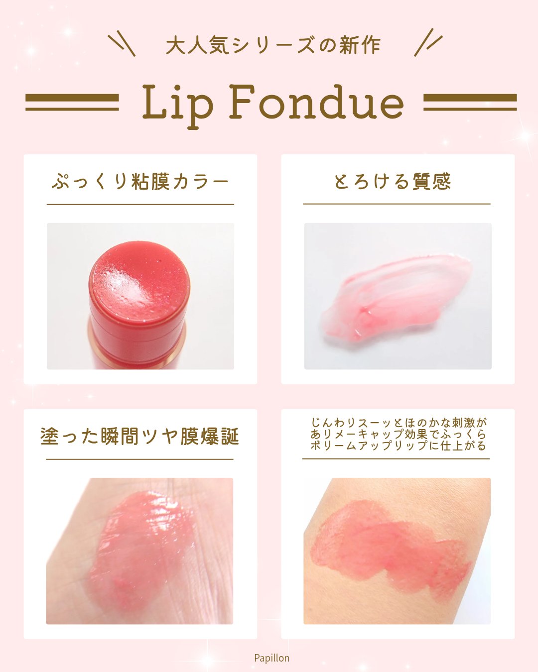 - とろけだすフォンデュのようなテクスチャーの色付きリッププランパー。 プランプ効果でボリュームアップリップへ導き、ぼってりとしたツヤ感とシアー感のある色づきを叶えます。