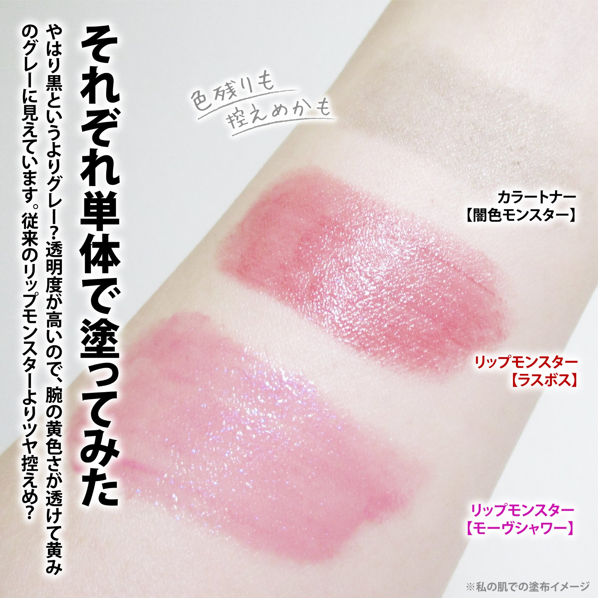 - 【数量限定発売】 口紅の上から重ねて色変化 長時間色持続する闇色モンスター。 当社独自の色持ち技術で、重ねるとモンスター化して落ちにくいリップへ! ■EX-1 苔色モンスター ライトグリーンのリップ上地で、ミルキーなくすみカラーへチェンジ。 ■EX-2 鉄色モンスター ライトグレーのリップ上地で、ダークなスモーキーカラーへチェンジ。 ■EX-3 闇色モンスター クリアブラックのリップ上地で、ダークな深みカラーへチェンジ。