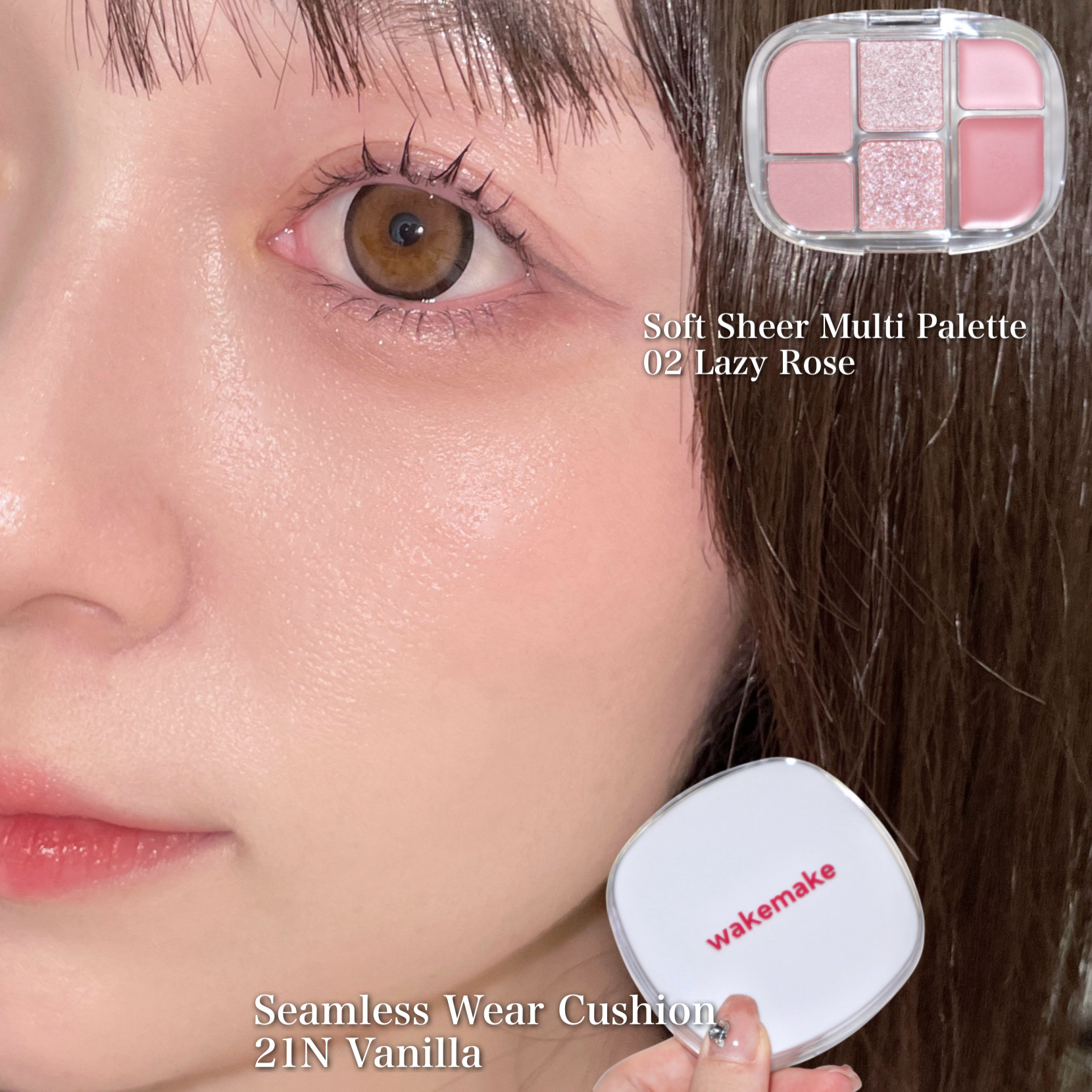 wakemake人気パレット&新作ファンデ📍wakemakeソフトシアーマルチパレット02レイジーローズアイメイク、チークハイライトに使えるマルチパレットで、統一感が出る!📍wakemakeシームレスウェアクッション21Nバニラ✔︎シームレス...