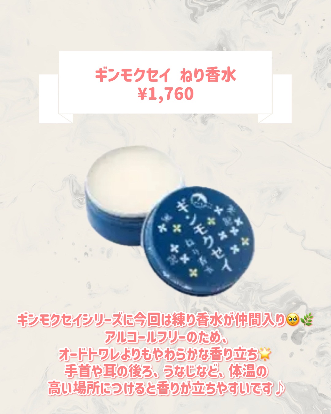 ふわっとやさしい香りで癒やされる☺ 本物の銀木犀の香りに近くてあまいフルーツのようで爽やかさもあってめちゃくちゃいい香り 癒やされながらしっとり保湿してくれる! 持ち運びやすいサイズで嬉しい✨ 甘い銀木犀とベルガモットのスッキリさとジャスミンの香りがふわっとしていい〜!秋はこれつけたくなるしきつすぎないのがいい😌🧡