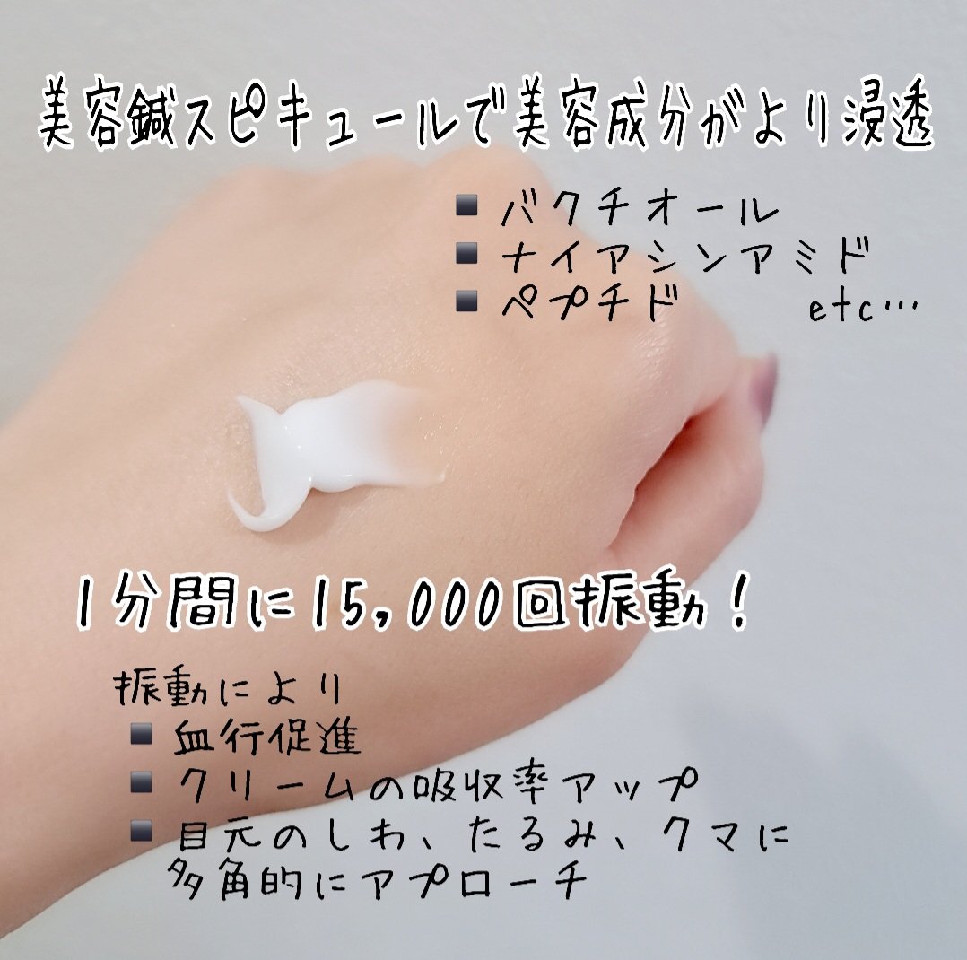 - 悩みが現れやすい目元を集中ケアするリッチな使用感のアイクリーム。次世代レチノールと呼ばれるバクチオール*1やナイアシンアミド*1、2種類のペプチド*1を配合。スピキュールの微細な刺激と高周波オート振動の心地よい振動で肌への浸透*2をサポートします。ハリと弾力のあるみずみずしい目元に導きます。 【使用方法】 チューブを押して気になる部分に適量塗り広げます。振動機部分を握り、先端のアプリケーターを肌に当て優しくマッサージするように肌に馴染ませます。 *1保湿成分 *2角質層まで