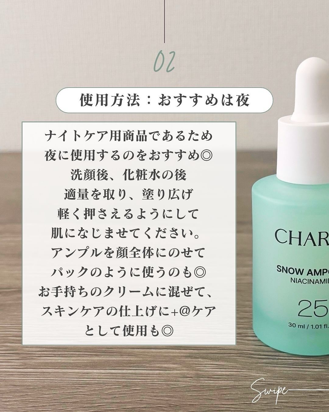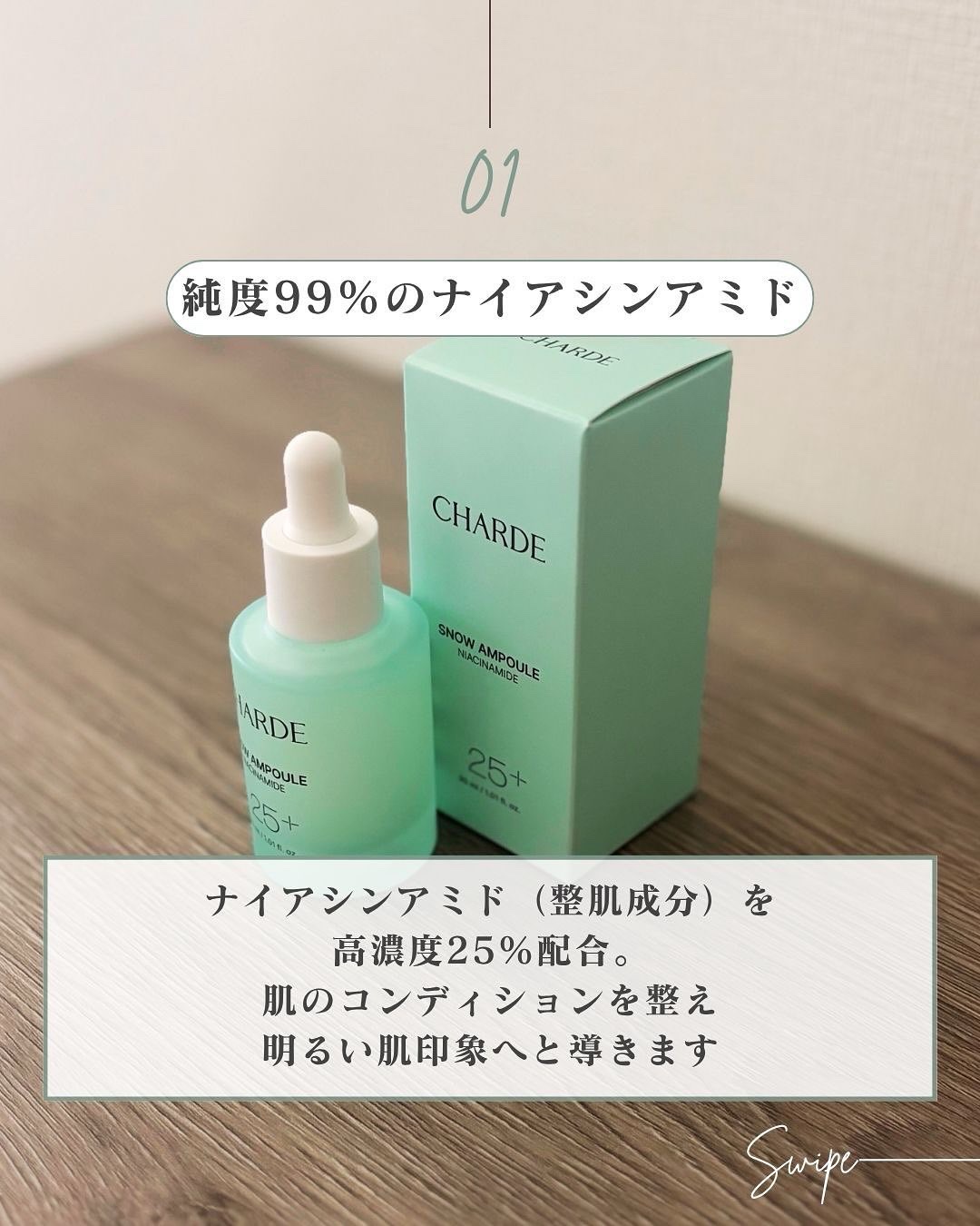 🩵CHARDE『スノーアンプル』をお試ししてみました✨以前の製品と比較して内容量がUPしパッケージもリニューアルしたそう🙌🏻純度99%のナイアシンアミドを25%配合したアンプルで気になるお肌のくすみ(※1)にアプローチ🌟うるおって明るい肌印象...