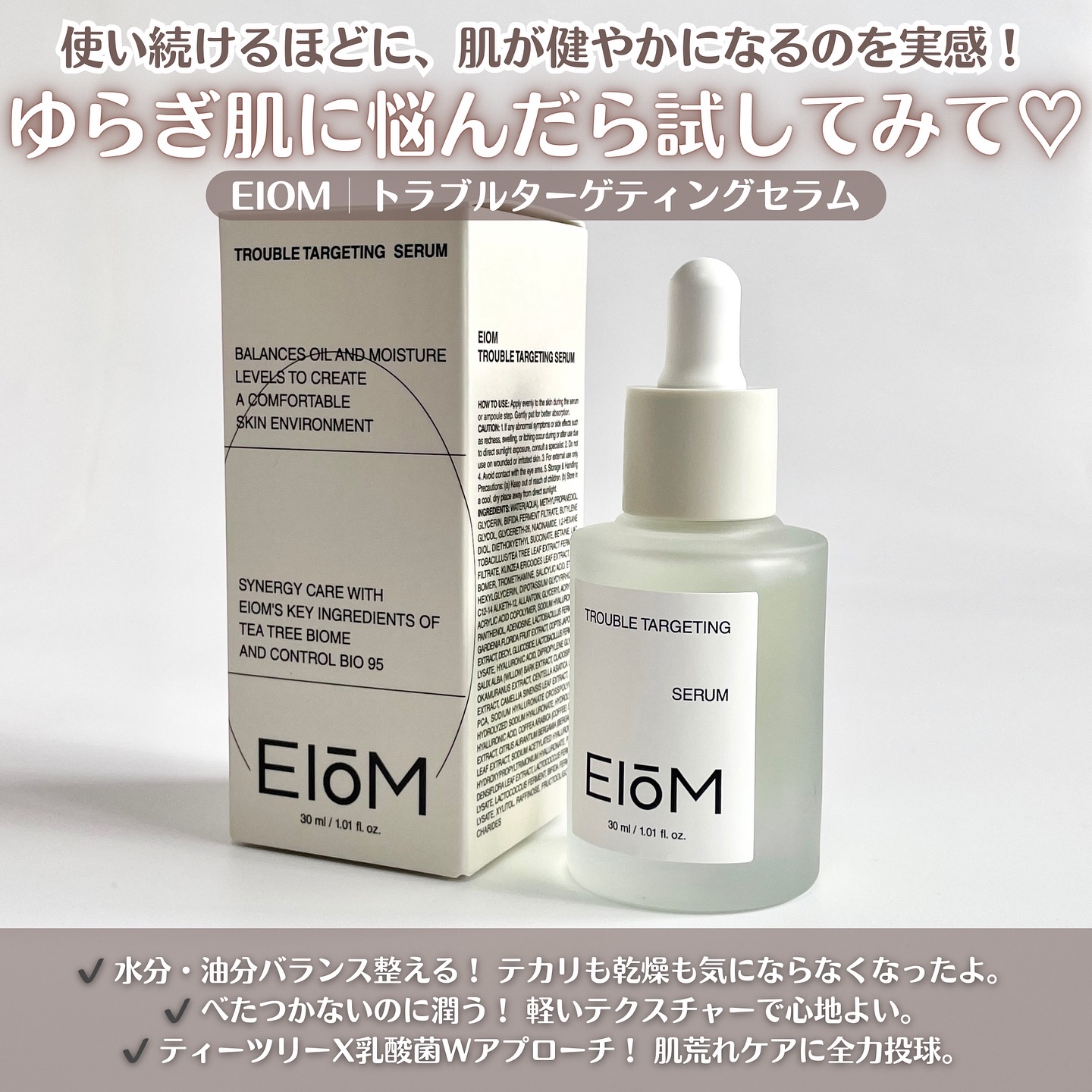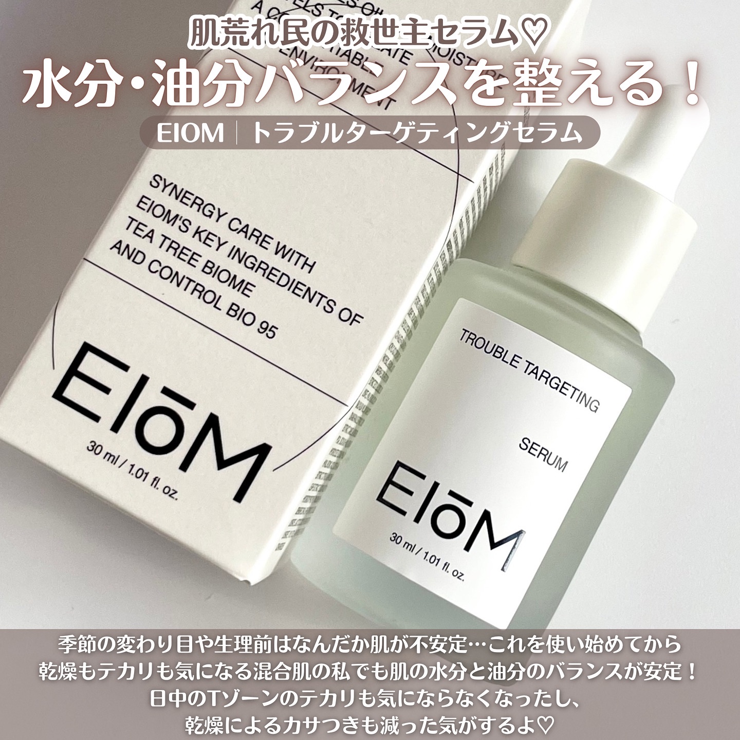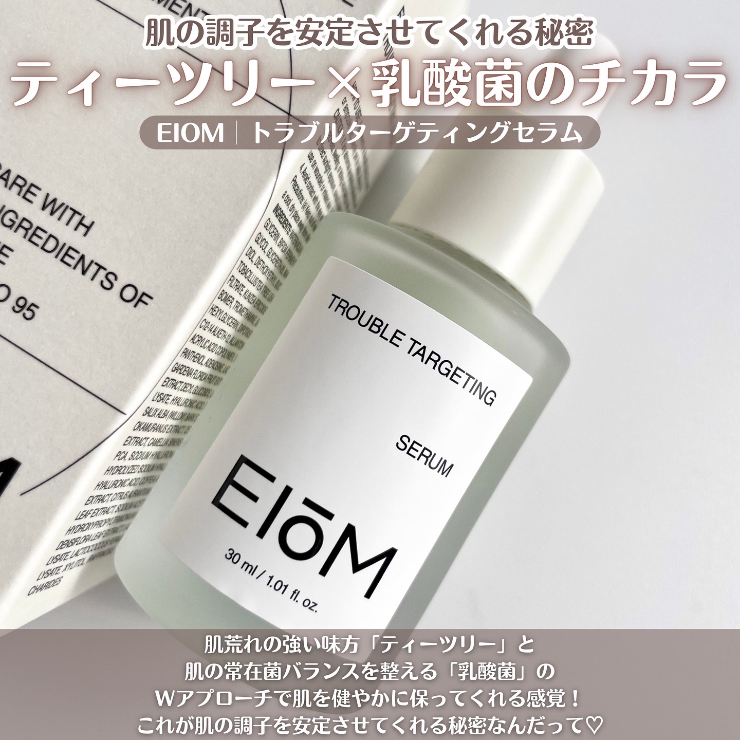 ❤︎〜韓国コスメ🇰🇷〜95億個の乳酸菌由来成分配合&ホワイトティーツリー由来成分配合🌿ティーツリーX乳酸菌Wアプローチでトラブルケア❣️【EIOM】トラブルターゲティングセラム30ml♡———————————————————————————♡...