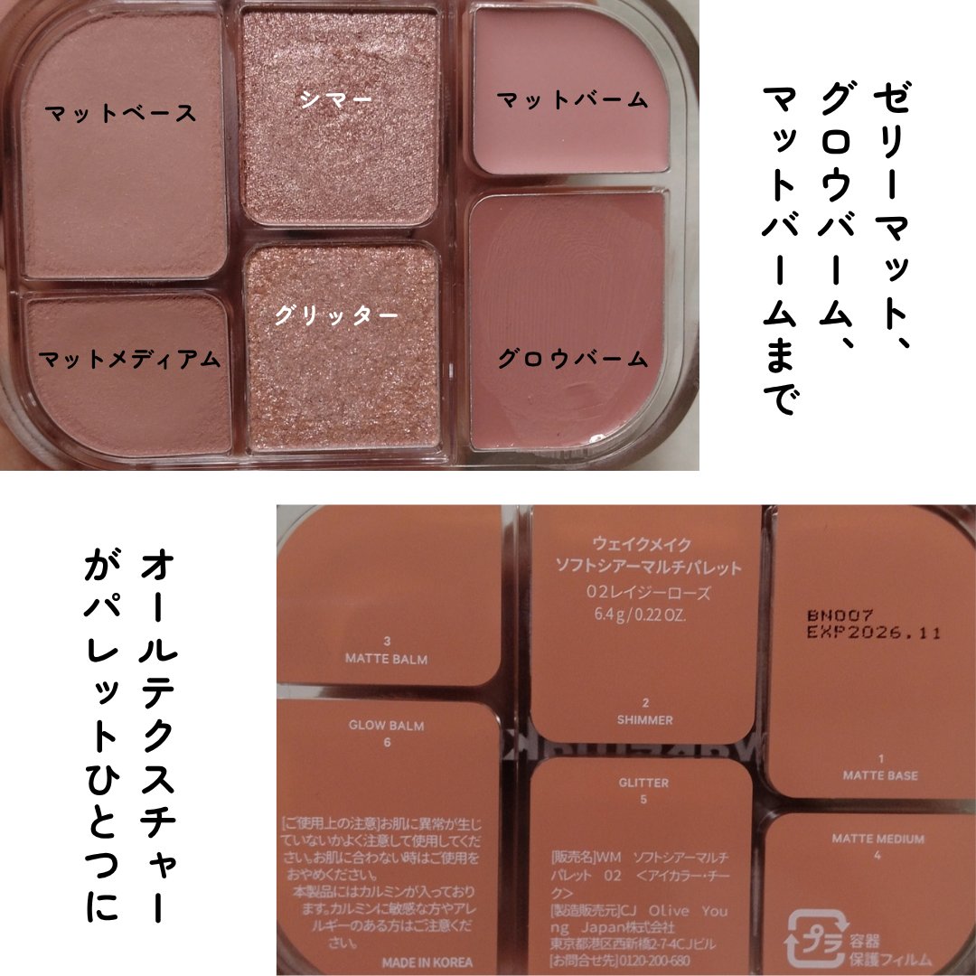 wakemakeソフトシアーマルチパレット02レイジーローズ¥2,640シームレスウェアクッション22Nニュートラル✔︎︎︎︎ソフトシアーマルチパレット水彩画パレットでハイライト、アイシャドウ、チークに◎色んな質感があってわたし的には左側がも...